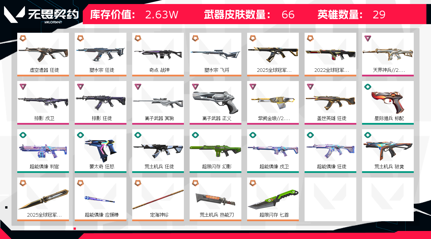 首页 > 租号大厅 > 无畏契约-wegame > wegame/wegame > 25冠军套,22幻影,塑水宗,全英雄可排位。禁止暴力炸,会封号!
