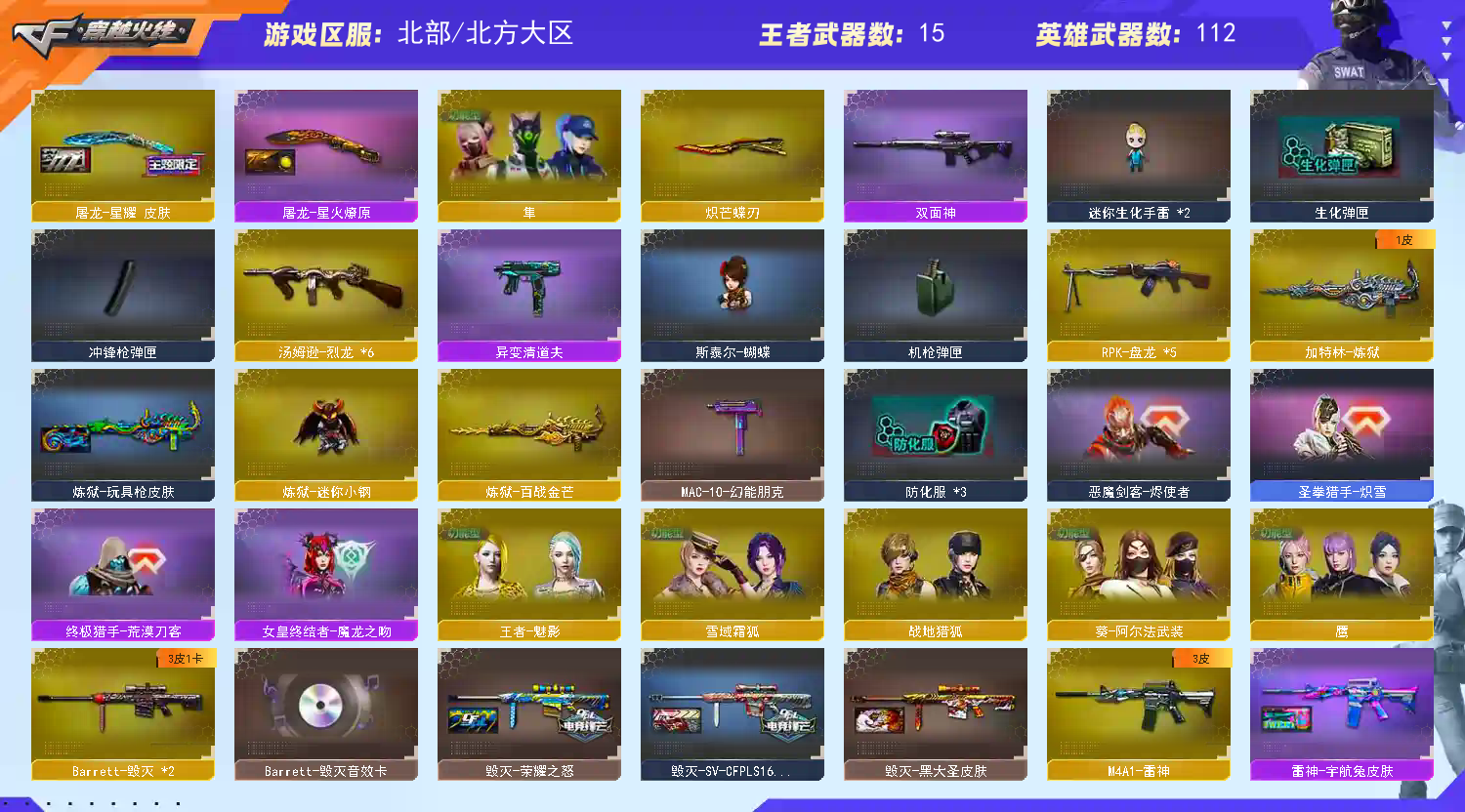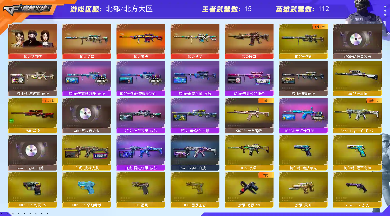 【商品标题】:北部北方大区-119V-可二次实名-【Lv.102-荣耀元帅】-【段位:荣耀之巅】 【稀有武器】:传说暗裔/传说圣灵/传说梦魇/传说灵眸/M200-幻神/Kar98K-星神/G36C-幻影/ScarLight-白虎(2)/HK417-朱雀/USP-雷暴/COP357-幻灵(2)/柯尔特-竞技荣光/柯尔特-冠军之特/QBZ03-金色蔷薇/AK47-火麒麟/M4A1-雷神/M4A1-黑骑士/白虎-电玩蓝兔(2)/Barrett-毁灭(2)/AWM-裁决/M200-竞技荣光/RPK-盘龙(5)/加特林-炼狱/汤姆逊-烈龙(6)/炽芒蝶刃/麒麟刺-堕天神/擎天-竞技荣光 【王者武器】:王者之心-觉醒版/QBZ-03-王者蔷薇-觉醒版/王者风神-觉醒版 【热门角色】:传说艾莉莎/鹰/隼/奇洋探员/乔伊教练/王者-魅影/炽天使/空/潘多拉-X/兔囡囡/幽/职业选手/潘多拉 【热门音效卡】:M200-幻神音效卡/AWM-裁决音效卡/Scar Light-白虎音效卡/Barrett-毁灭音效卡/M4A1-黑骑士音效卡/M4A1-黑龙音效卡 【热门皮肤】:幻神-宠儿-2021MVP/M200-幻神-荣耀世冠白鲨/幻神-周瑜皮肤/幻神-动感闪耀皮肤/屠龙-星耀皮肤/白虎-虎啸皮肤/屠龙-星火燎原/擎天-冠军之击/火麒麟-巅峰荣耀/白虎-霓虹机甲 皮肤/白虎-电玩粉兔皮肤/ScarLight-白虎-暗星/毁灭-荣耀之怒/雷神-荣耀之魄 【其他亮点】:斯泰尔-蝴蝶/炼狱-迷你小钢/异变清道夫/贝雷塔687-射手座/金刚伞-电玩红兔 (截图展示段位不代表实际段位,如赛季更新等不可抗拒因素发生变化,其余道具看截图或咨询客服);USP-雷暴,USP-雷暴王者,柯尔特-冠军之特,炽芒蝶刃,隼,传说艾莉莎,RPK-盘龙,