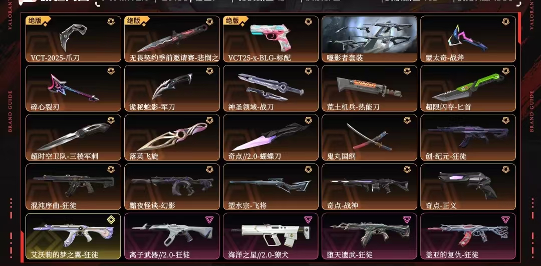 1;奇点 战神,VCT 2025 爪刀,盖亚的复仇 狂徒,噬影者 狂徒,侦察力量 幻影,堕天遗武 狂徒,混沌序曲 狂徒,