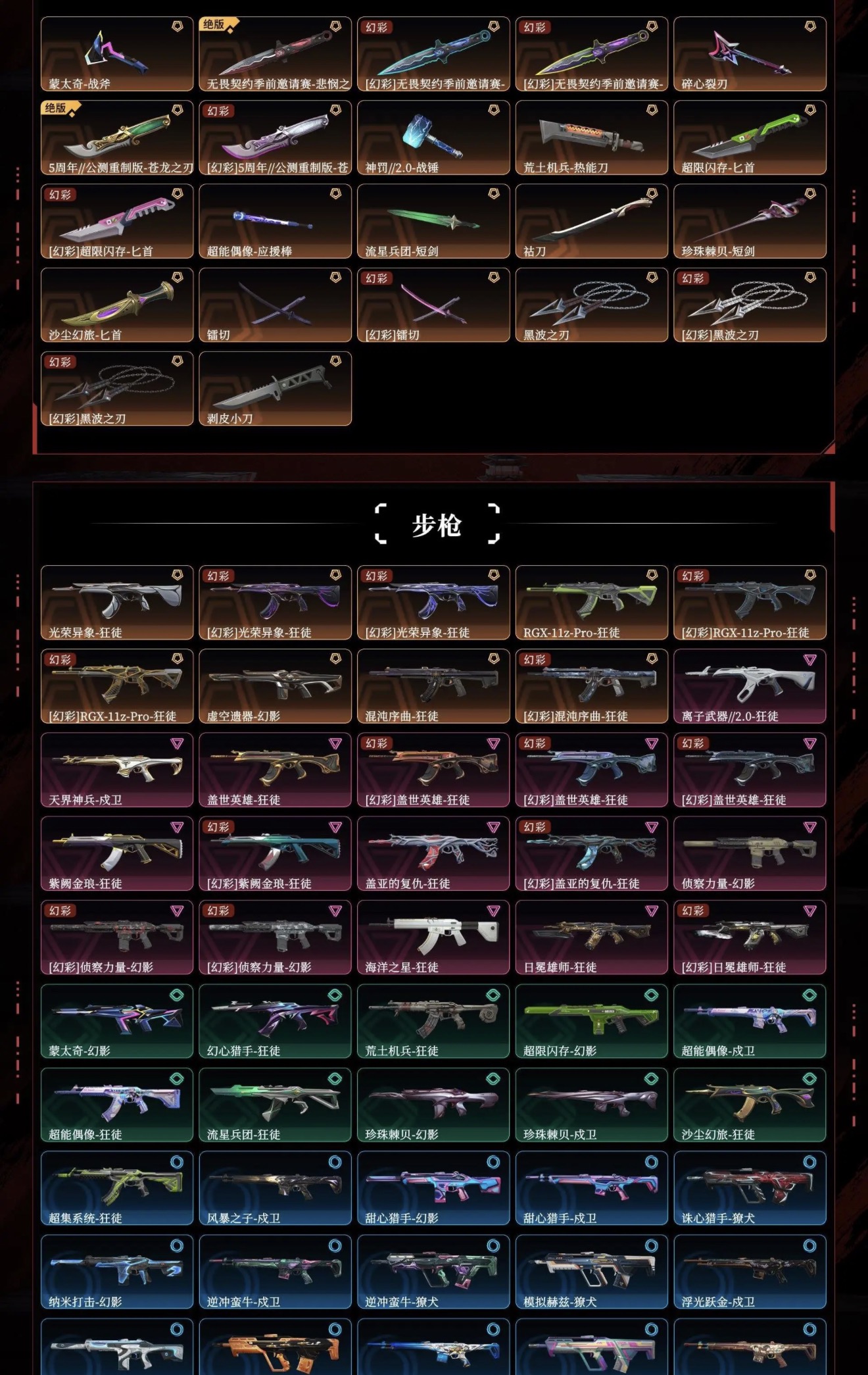 【拥有步枪】光荣异象-狂徒,RGX-11z-Pro-狂徒,虚空遗器-幻影,混沌序曲-狂徒,离子武器//2.0-狂徒,天界神兵-戍卫,盖世英雄-狂徒,紫阙金琅-狂徒,盖亚的复仇-狂徒,侦察力量-幻影,海洋之星-狂徒,日冕雄师-狂徒,蒙太奇-幻影,幻心猎手-狂徒,荒土机兵-狂徒,超限闪存-幻影,超能偶像-戍卫,超能偶像-狂徒,流星兵团-狂徒,珍珠棘贝-幻影,珍珠棘贝-戍卫,沙尘幻旅-狂徒,超集系统-狂徒,风暴之子-戍卫,甜心猎手-幻影,甜心猎手-戍卫,诛心猎手-獠犬,纳米-幻影,逆冲蛮牛-戍卫,逆冲蛮牛-獠犬,模拟赫兹-獠犬,浮光跃金-戍卫,聚合之力-幻影,采蜜小蜂队-獠犬,战术熊与伙伴们-戍卫,复古浪潮-獠犬,萌彩剪影-戍卫,胡桃狂想-獠犬,