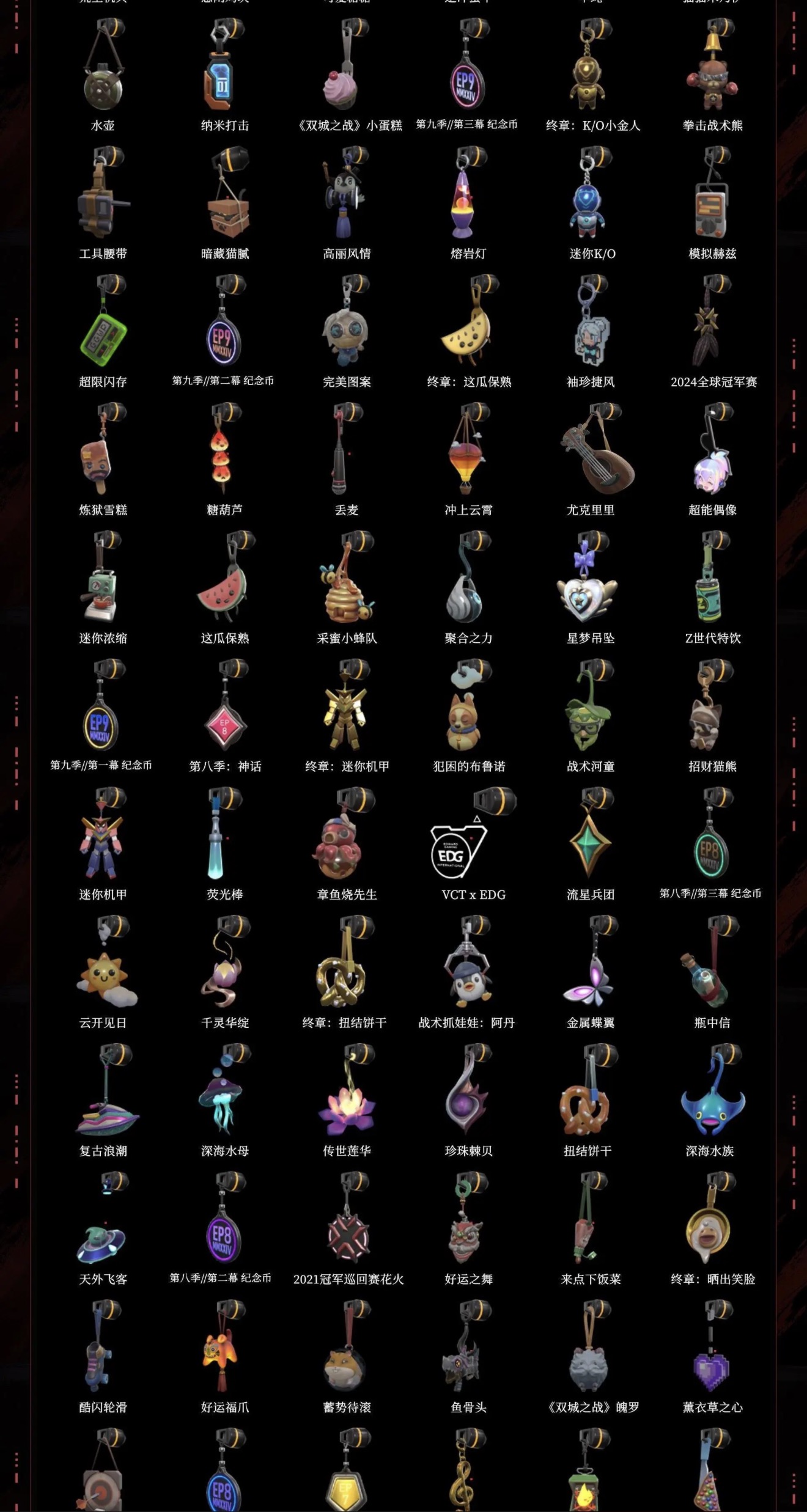 【稀有挂件】V25第六幕钻石挂饰,不烂的挂饰,V25第三幕超凡挂饰,第九季神话挂饰,终章猫猫木乃伊挂饰,猫猫木乃伊挂饰,拳击战术熊挂饰,熔岩灯挂饰,袖珍捷风挂饰,2024全球冠军赛挂饰,糖葫芦挂饰,超能偶像挂饰,迷你浓缩挂饰,采蜜小蜂队挂饰,第八季神话挂饰,终章迷你机甲挂饰,战术河童挂饰,迷你机甲挂饰,章鱼烧先生挂饰,云开见日挂饰,金属蝶翼挂饰,传世莲华挂饰,2021冠军巡回赛花火挂饰,好运福爪挂饰,薰衣草之心挂饰,瞄这里挂饰,第七季黄金挂饰,幸运中国结挂饰,