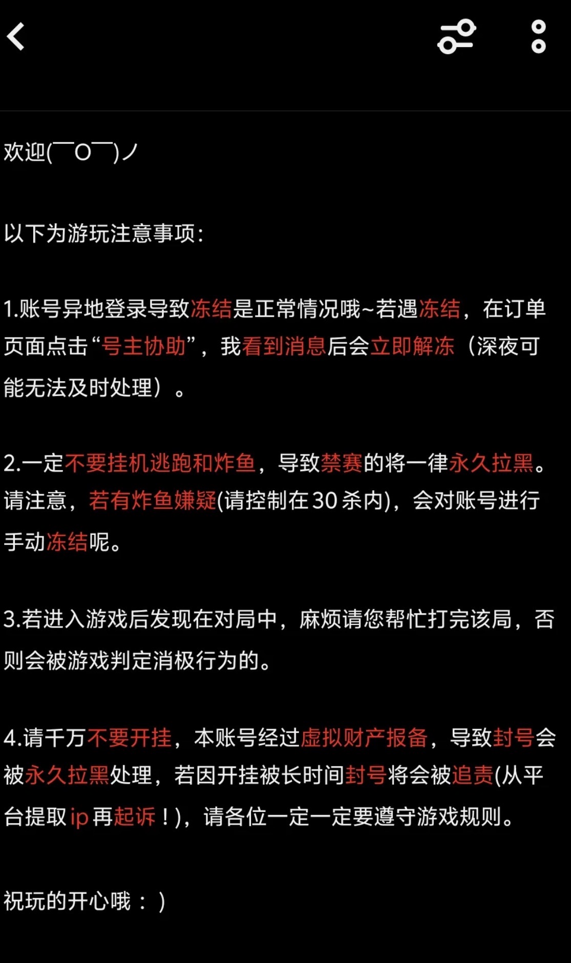 (1)存在游戏记录且订单时间超过15分钟,默认为您认可该笔订单游戏账号中的属性,平台不再退还剩余租金,请合理安排游戏时间,谨慎选择投诉类型。