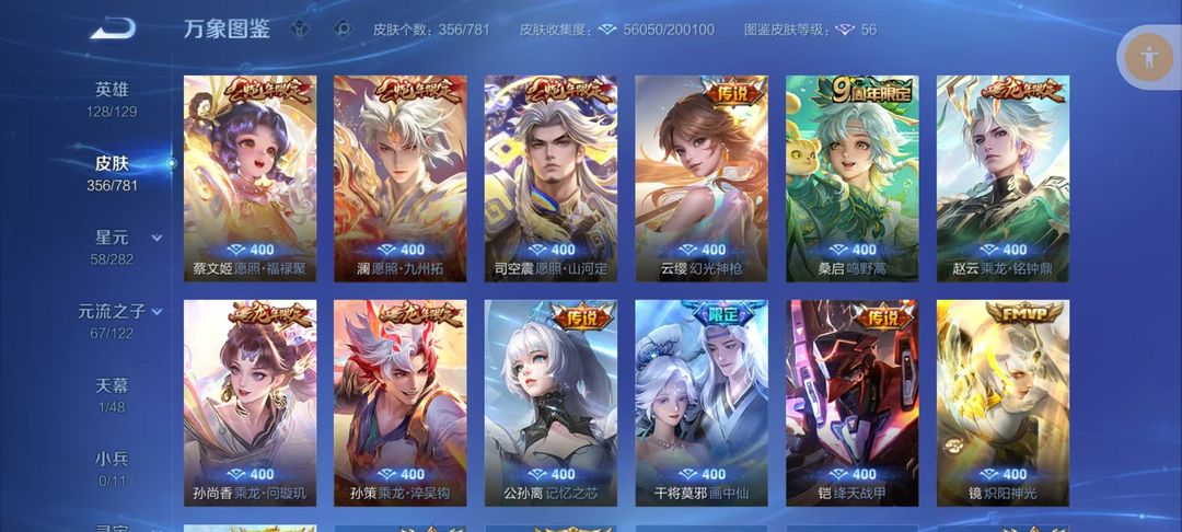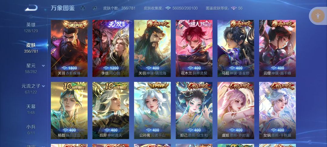 v10、537皮6水4无双、安琪拉-颠倒童话·魔镜、朵莉亚-神骥、遇见神鼓、齐天大圣、白虎志、韩信荣耀典藏、73传说、时之魔女、瑶无双、青丘、九尾、神器明辉仪