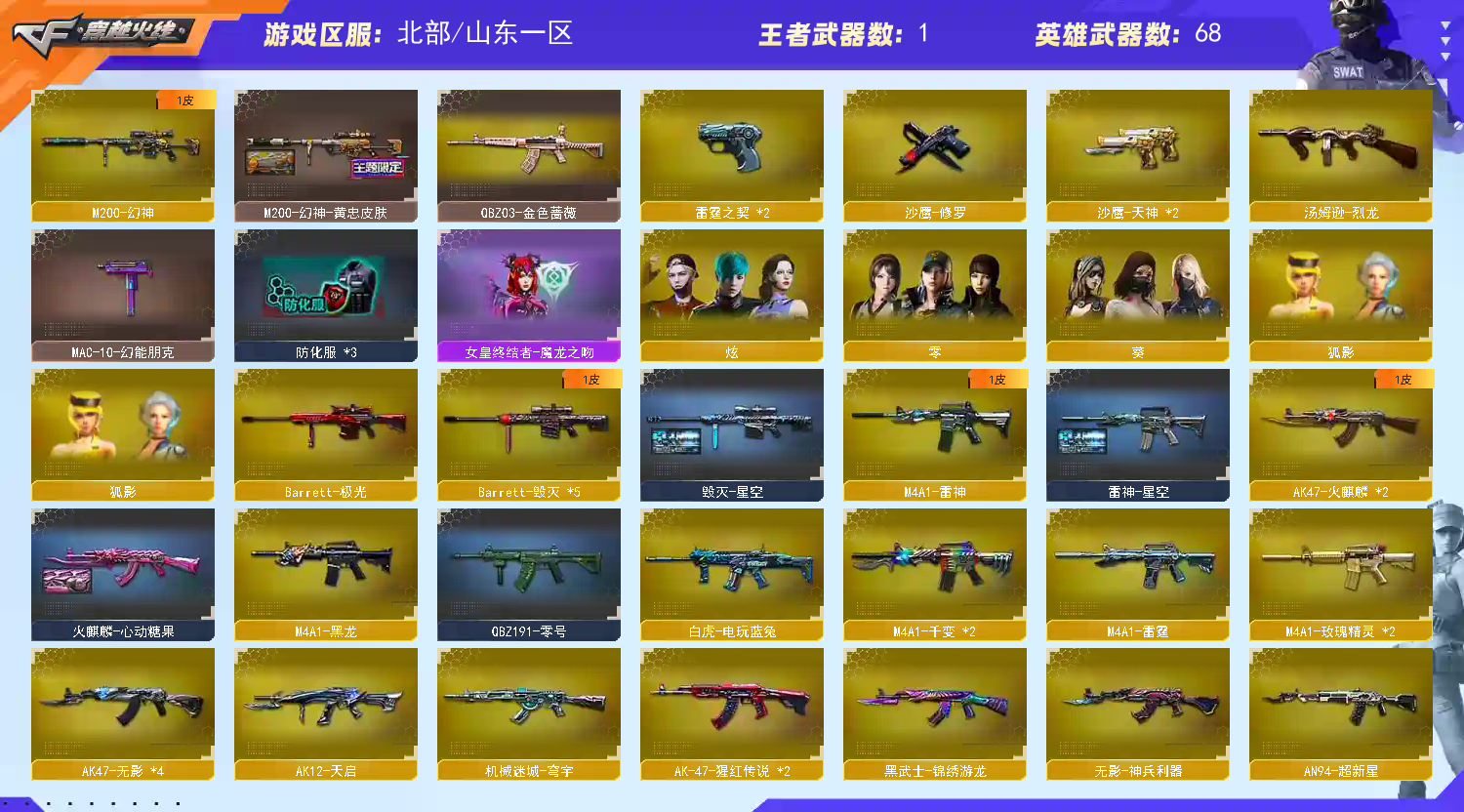 68V黄忠幻神金色蔷薇毁灭天龙极光修罗天神玫瑰精灵火麒麟雷神无影死神超新星;QBZ03-金色蔷薇,M200-幻神,