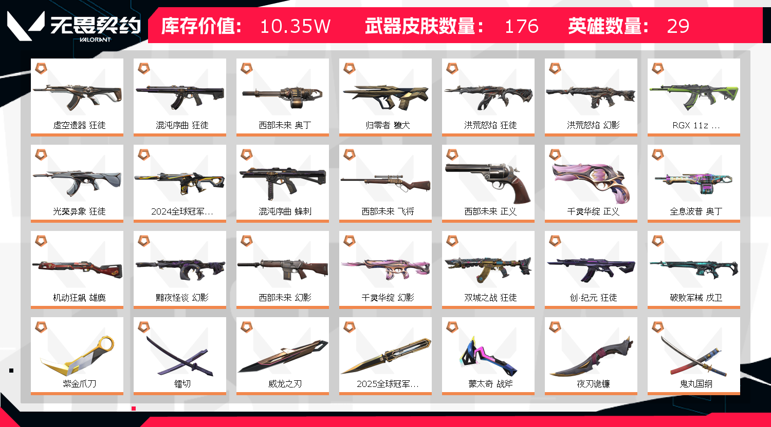 首页 > 租号大厅 > 无畏契约-wegame > wegame/wegame > 10W库/26篆刀25冠军套24冠军套西部未来套21刀皮20幻影皮19狂徒皮