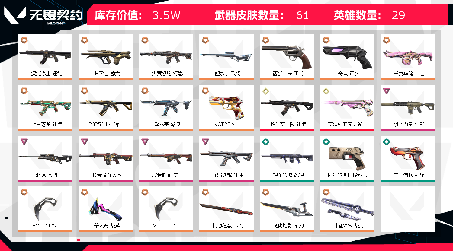 允许 英雄28 武器皮肤数量61;VCT 2025 爪刀,归零者 獠犬,侦察力量 幻影,洪荒怒焰 幻影,混沌序曲 狂徒,塑水宗 飞将,起源 冥驹,