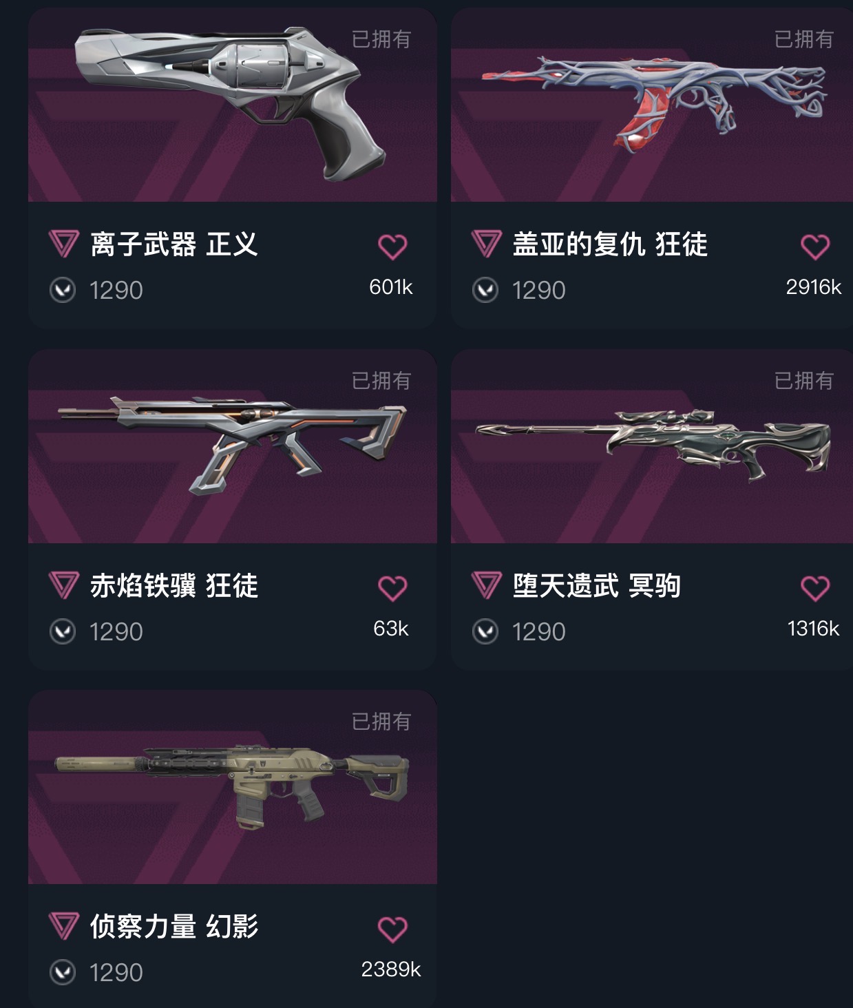 怜悯之刃/塑水狂徒/马年狂徒/三棱/侦查/幻影盖亚狂徒/弃王大狙/离子正义 特效等级全满,可排位炸鱼诡秘蛇影套+末日之翼套排位可匹;盖亚的复仇 狂徒,侦察力量 幻影,塑水宗 狂徒,堕天遗武 冥驹,离子武器 正义,