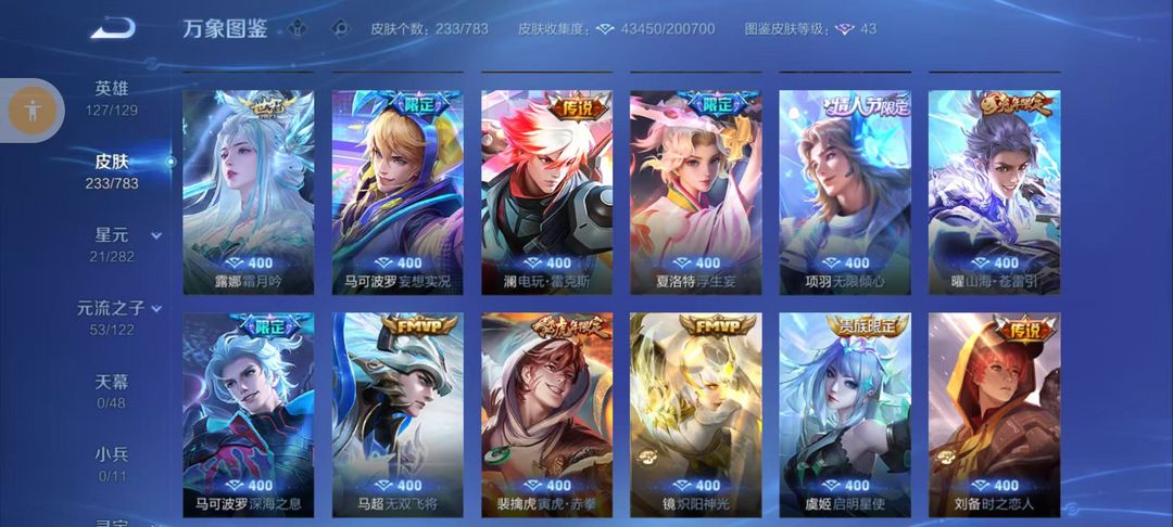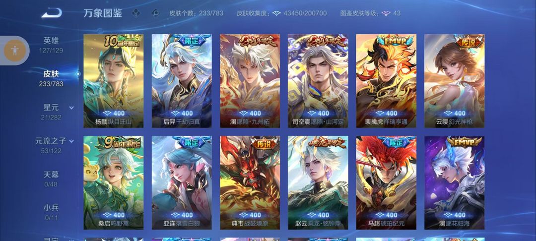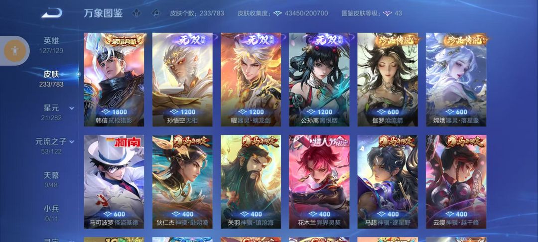 扫码登录。VIP10。385皮肤,七水,四星元,双王者之证!武则天神域,李白荣耀典藏,全息碎影,全符文,各种限定,各种机甲,皮肤都有,绝对满足各位
