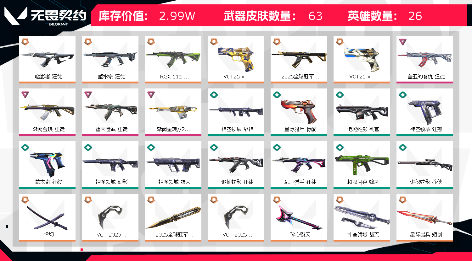 文明游玩,谢谢;镭切,VCT 2025 爪刀,盖亚的复仇 狂徒,噬影者 狂徒,紫阙金琅 狂徒,RGX 11z Pro 狂徒,堕天遗武 狂徒,