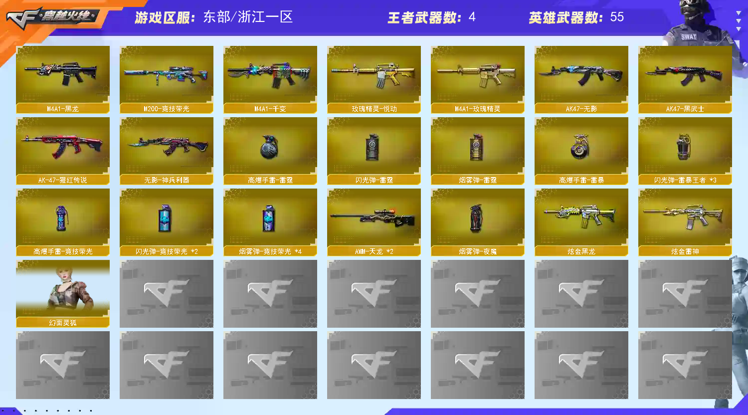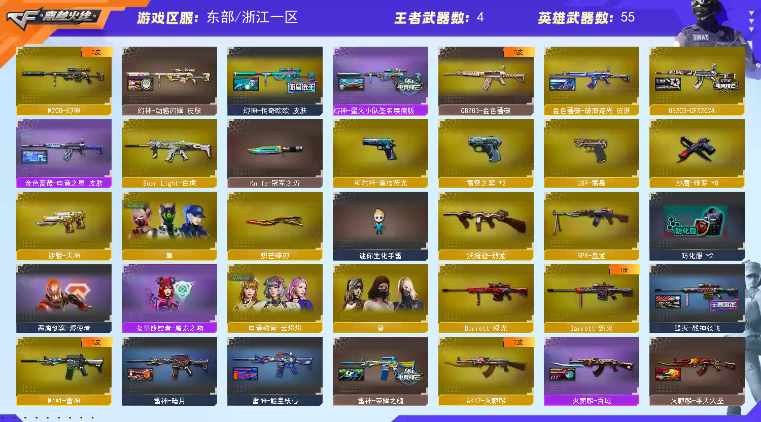 【M200-幻神+幻神-传奇欧欧+幻神星火小队+幻神动感闪耀+Knife-冠军之刃】【竞技荣光套】【ScarLight-白虎】【QBZ03-金色蔷薇+cfs2024+破浪逐光】【Barrett-毁灭】【极光】【AK47-火麒麟】【黑龙】【M4A1-雷神+雷神-荣耀之魄】【无影 黑武士】【13手枪 修罗*8 天神 cop雷霆*2 usp雷暴 竞技荣光】【10近战 屠龙*3 龙啸*2 擎天 麒麟刺 炽芒蝶刃蝴蝶刀】【手雷 雷霆雷 雷暴雷 竞技荣光】【角色 葵 隼 幻面灵狐】;USP-雷暴,炽芒蝶刃,Knife-冠军之刃,隼,电竞教官-云悠悠,RPK-盘龙,QBZ03-金色蔷薇,