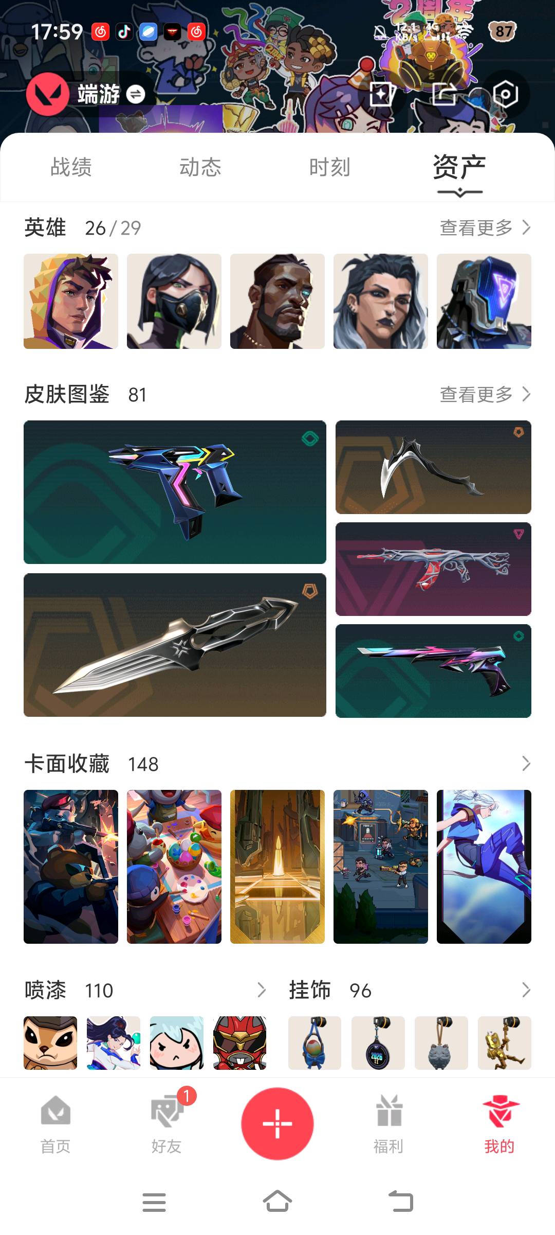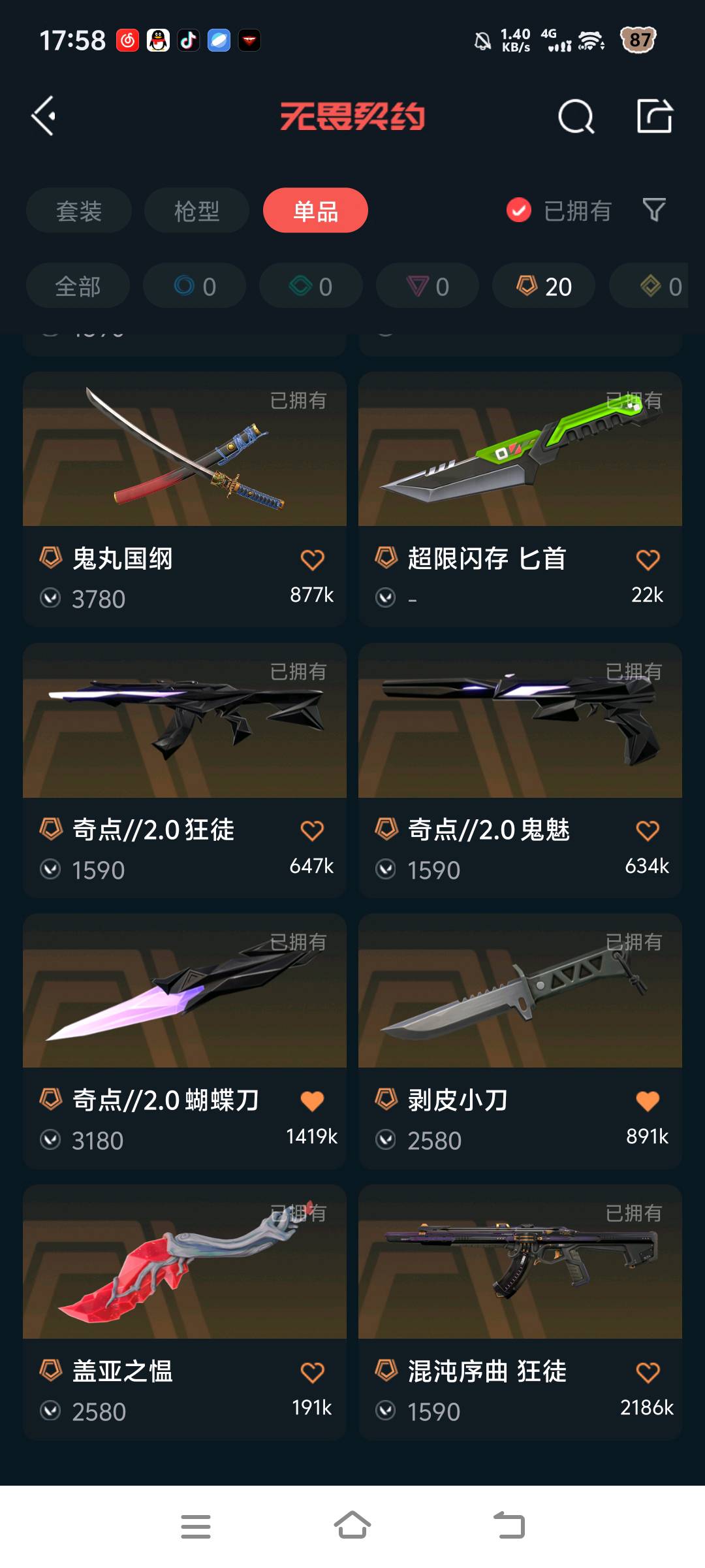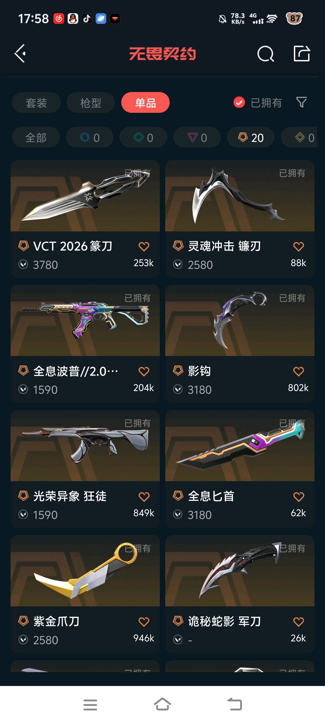 允许 英雄26 武器皮肤数量81;紫金爪刀,剥皮小刀,VCT 2025 爪刀,盖亚的复仇 狂徒,掠影 狂徒,紫阙金琅 狂徒,堕天遗武 狂徒,