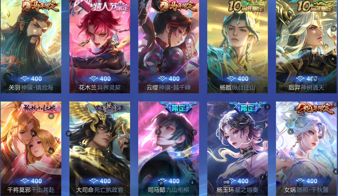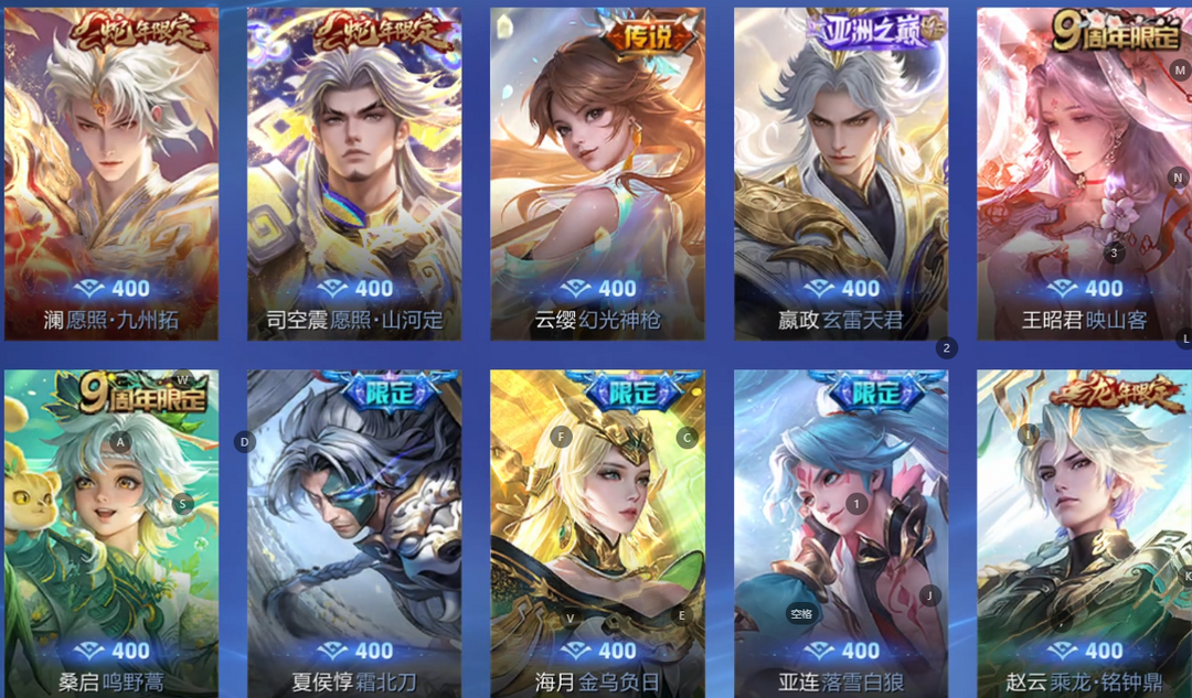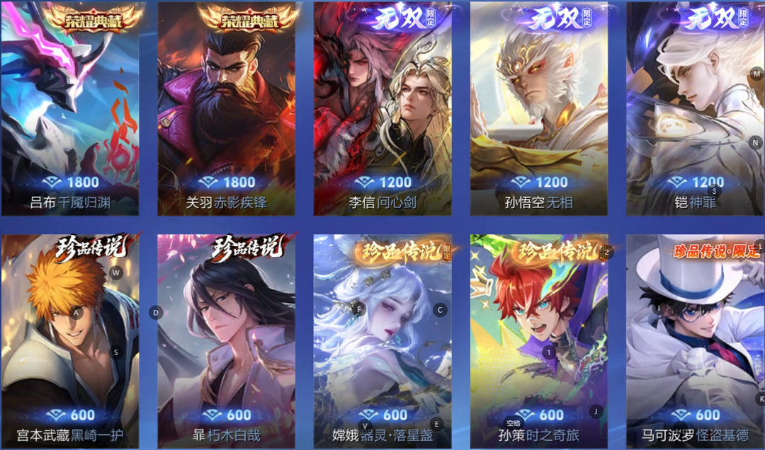 V10、550皮14水、吕布典藏-千魇归渊、云缨-神骥·越千峰、怪盗基德、伽罗星传说红枫、瑶典藏拾光映像、冥王哈迪斯、、龙年限定、齐天大圣