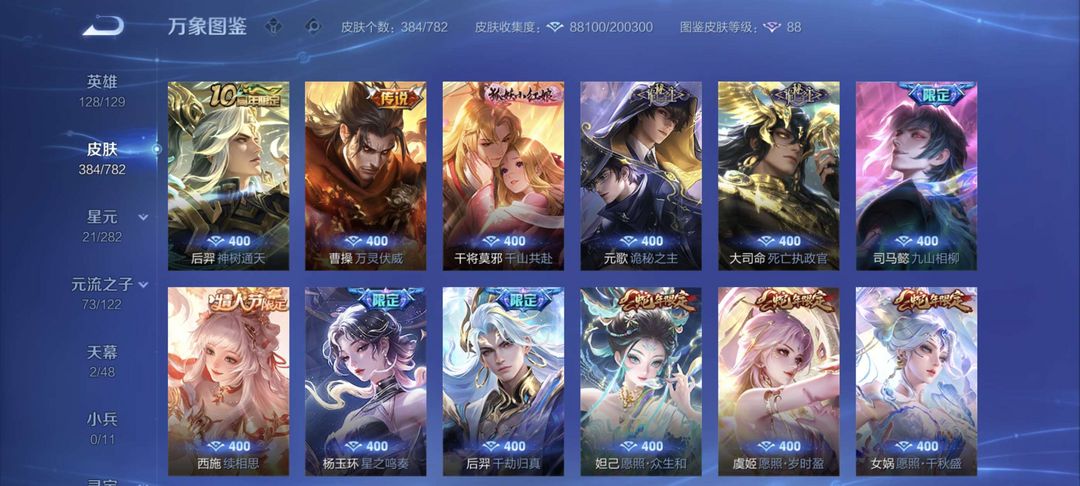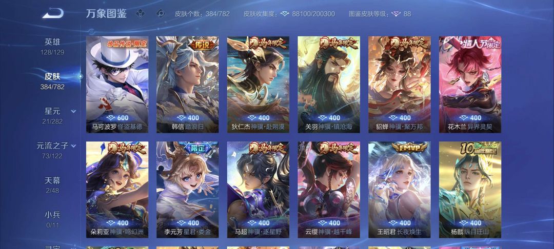 V10、550皮14水、吕布典藏-千魇归渊、云缨-神骥·越千峰、怪盗基德、伽罗星传说红枫、瑶典藏拾光映像、冥王哈迪斯、、龙年限定、齐天大圣