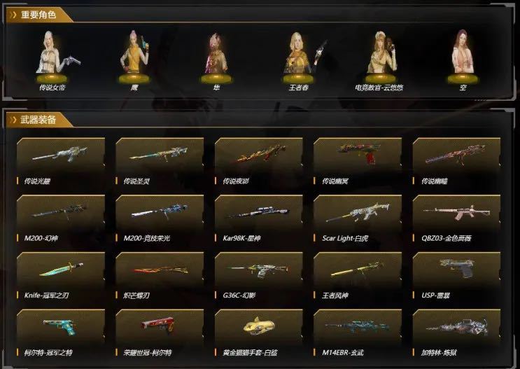 【传说女帝/传说圣灵/传说光耀/传说夜影/传说幽冥/传说幽瞳】【鹰/隼/荒漠琉璃】【竞技荣光套/神工天巧套/夜魔套/6烈龙/6盘龙】【M200-幻神*2/M200-幻神音效卡/幻神-星火小队签名臻藏版 皮肤/M200-幻神-荣耀世冠白鲨/幻神-AG-CFPLS17冠军/幻神-青鹤/幻神-星耀 皮肤/幻神-荣耀世冠白鲨2023 皮肤*2】【M200-竞技荣光】【Kar98K-星神/Kar98K-星神音效卡/星神-破竹皮肤/星神-巅峰荣耀 皮肤】【王者之幻/王者风神】【炽芒蝶刃*3/炽芒蝶刃-荣耀世冠白鲨2023 皮肤】【Knife-冠军之刃/黄金猫猫手套-白鲨】【G36C-幻影*2】【柯尔特-冠军之特*3/荣耀世冠-柯尔特*2/柯尔特-竞技荣光/USP-雷暴/USP-雷暴王者/USP-神工天巧/柯尔特-荣耀世冠白鲨2023】【Scar Light-白虎/Scar Light-白虎音效卡/白虎-大汉风骨】【QBZ03-金色蔷薇/QBZ03-金色蔷薇音效卡/QBZ03-CFS2024 皮肤/QBZ03-传奇宠儿/QBZ03-冠军之薇】【QBZ03-天罚*2/QBZ03-天罚音效卡】【雷神-荣