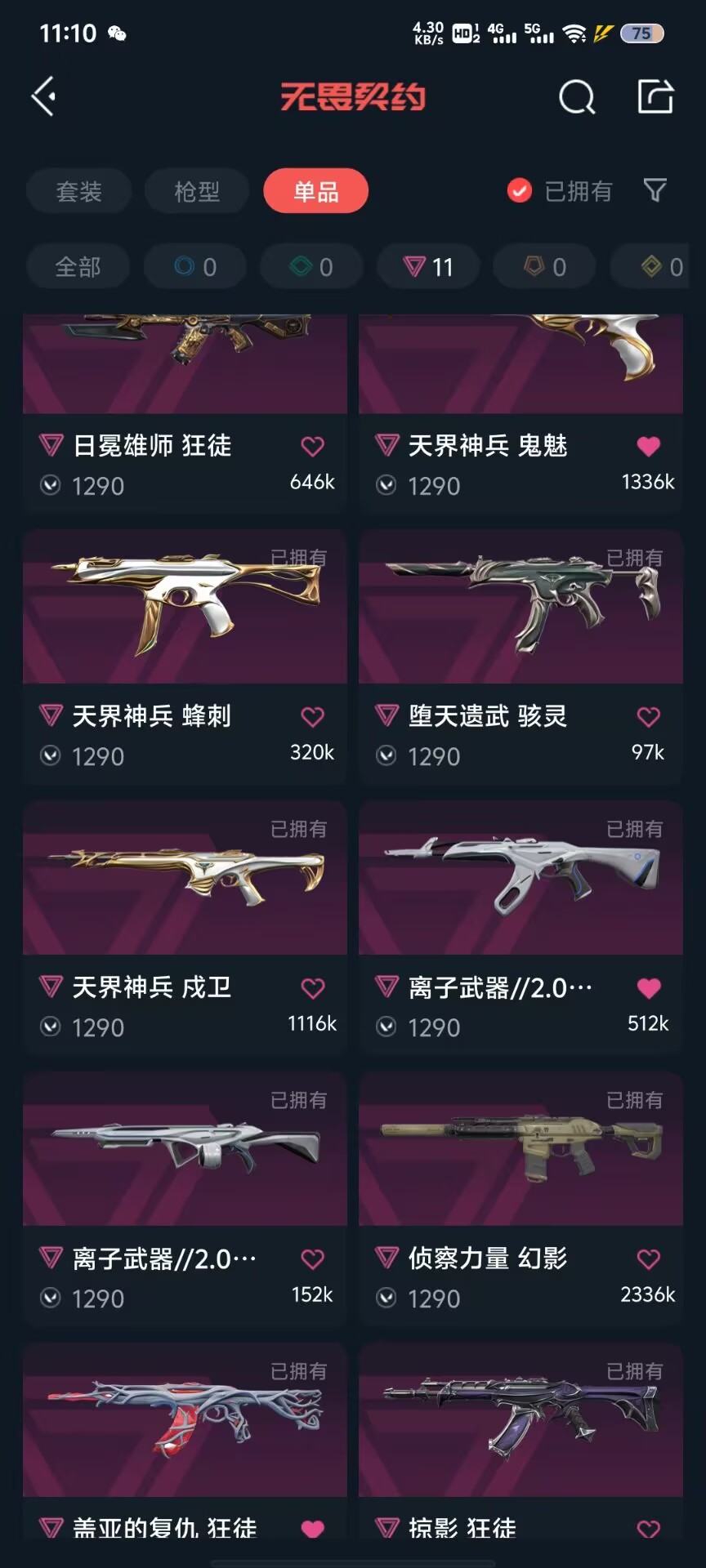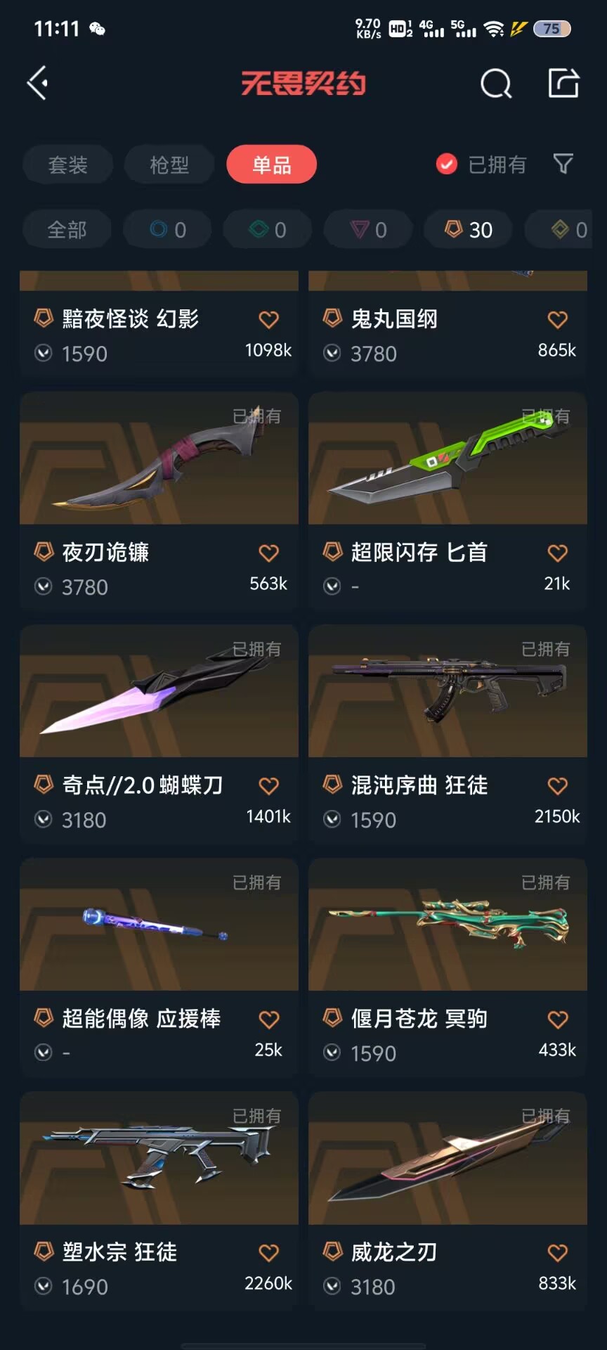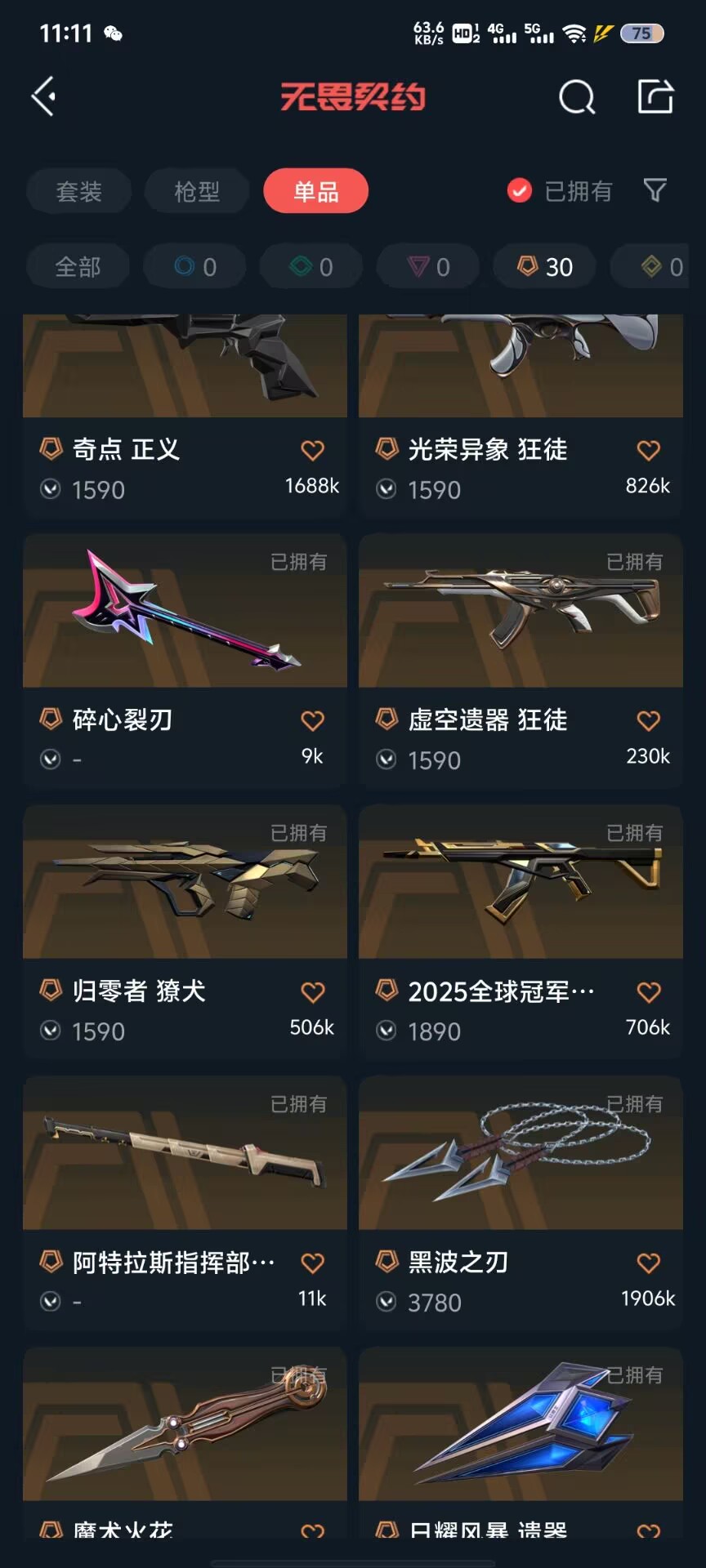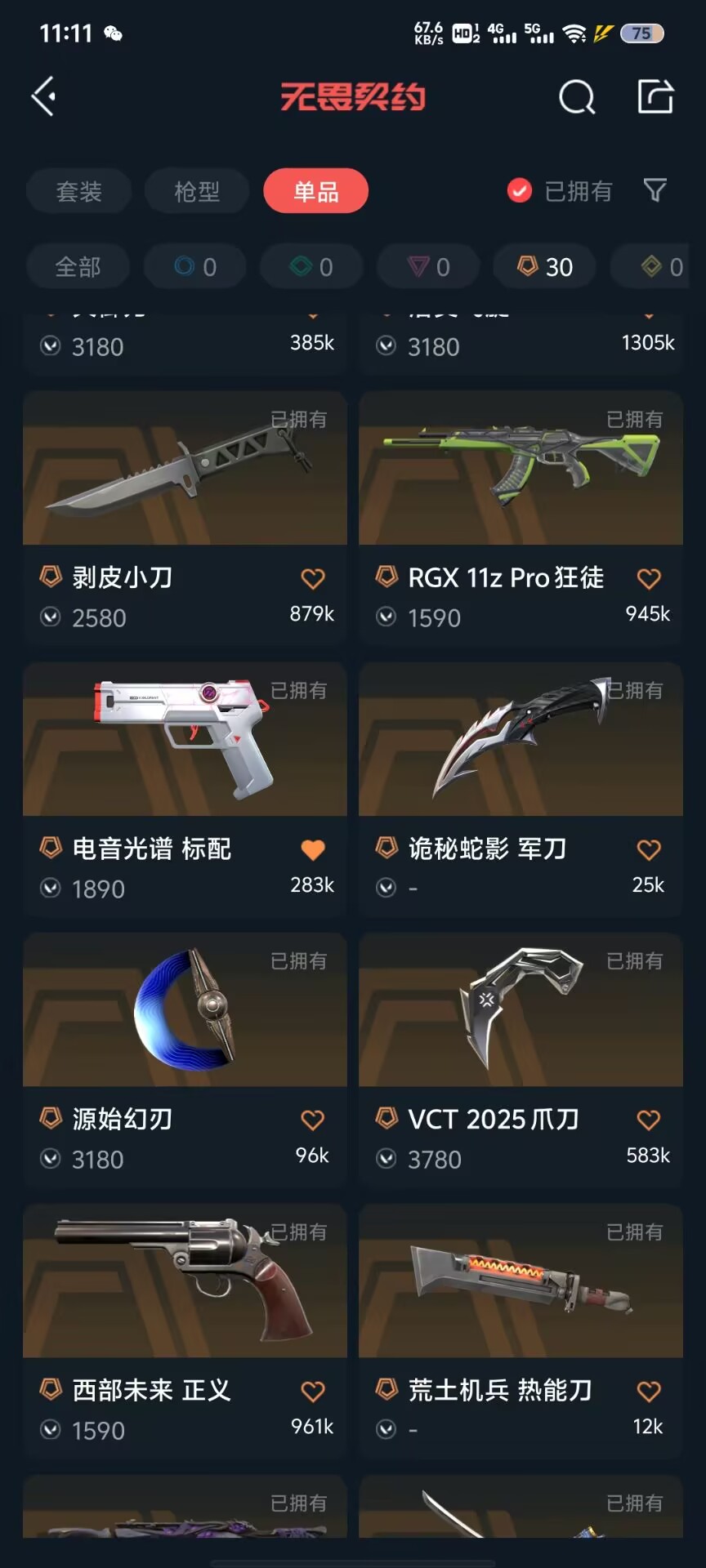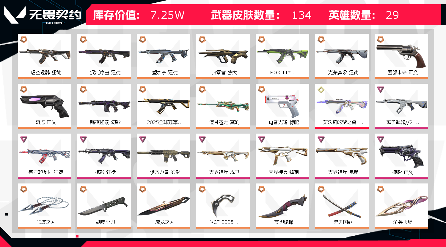 可排位 英雄28 武器皮肤数量134;黑波之刃,剥皮小刀,威龙之刃,VCT 2025 爪刀,归零者 獠犬,盖亚的复仇 狂徒,虚空遗器 狂徒,