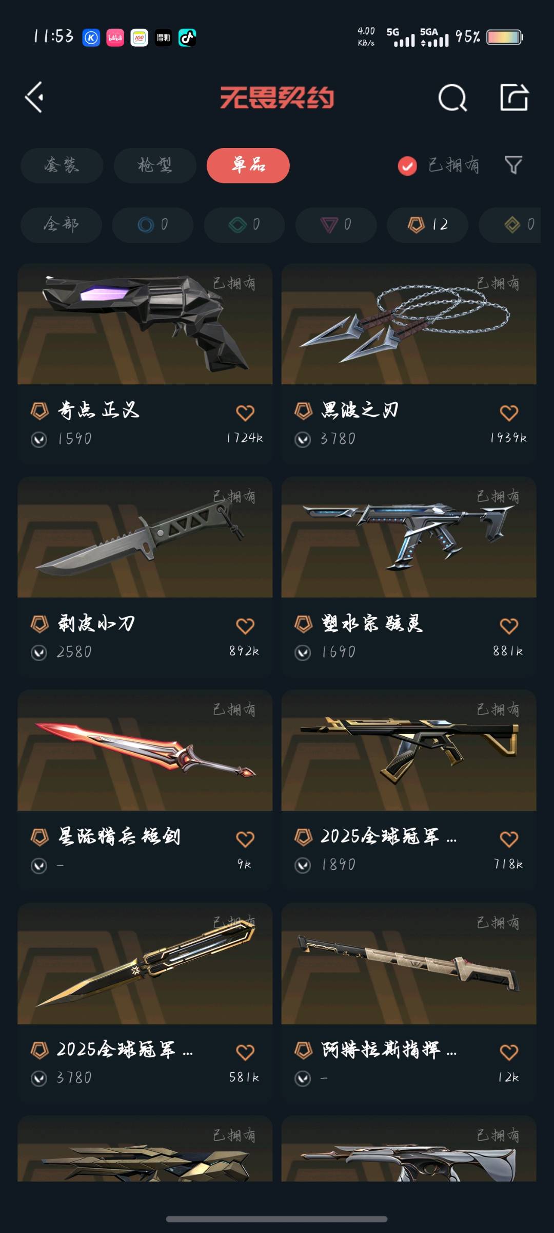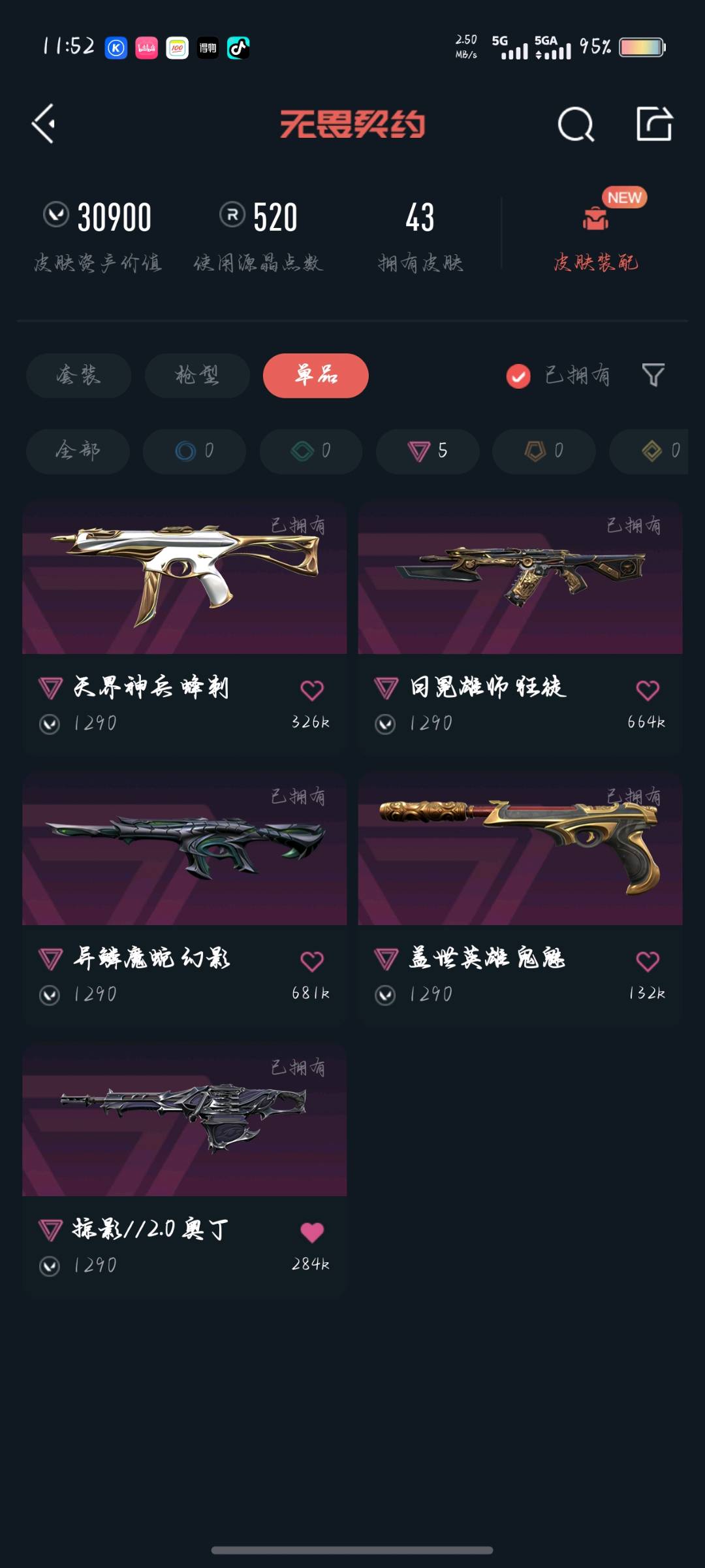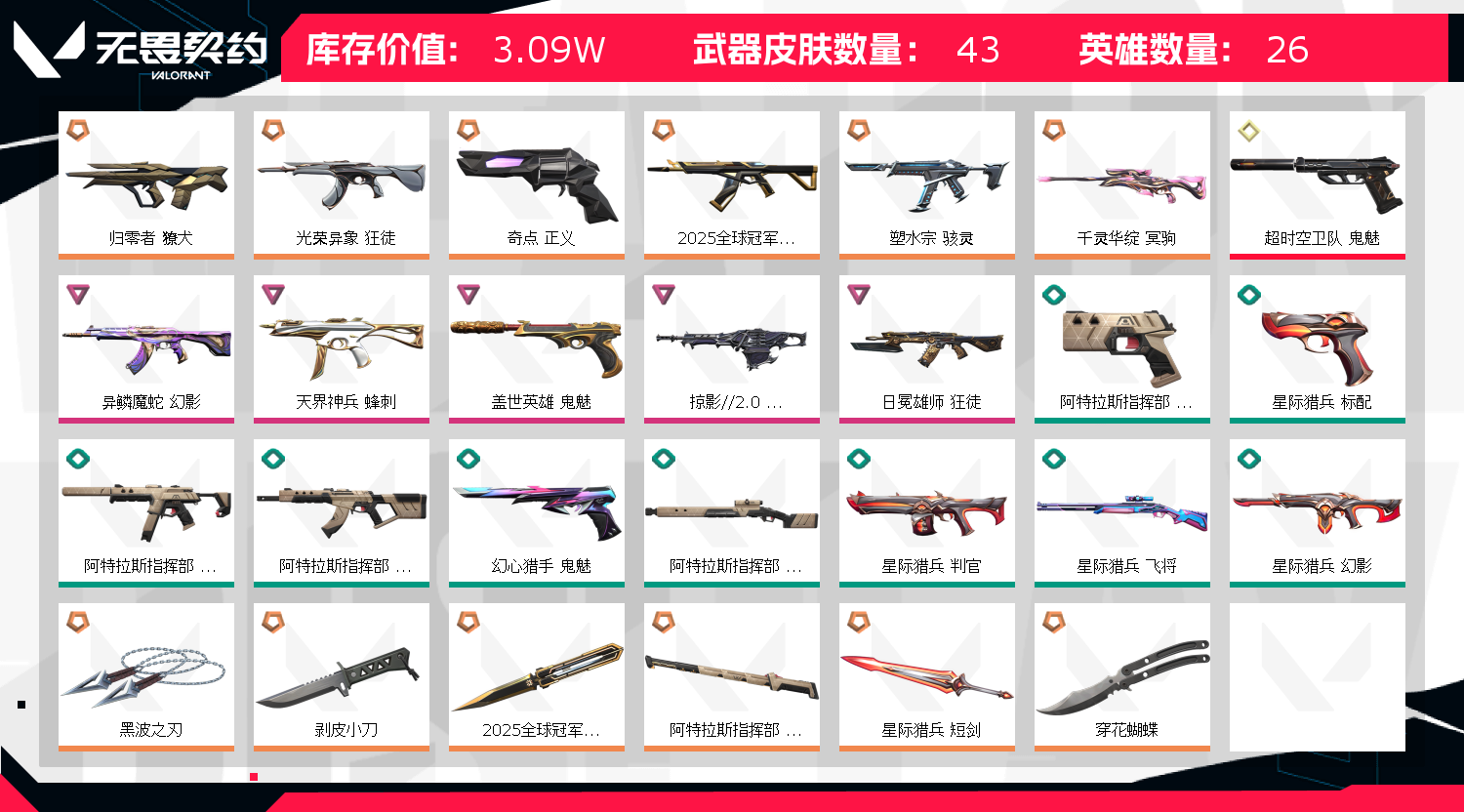 允许 英雄29 武器皮肤数量43;黑波之刃,剥皮小刀,归零者 獠犬,异鳞魔蛇 幻影,光荣异象 狂徒,天界神兵 蜂刺,盖世英雄 鬼魅,
