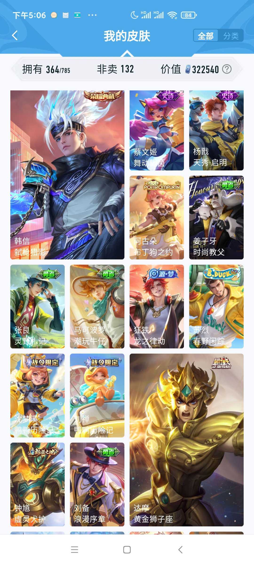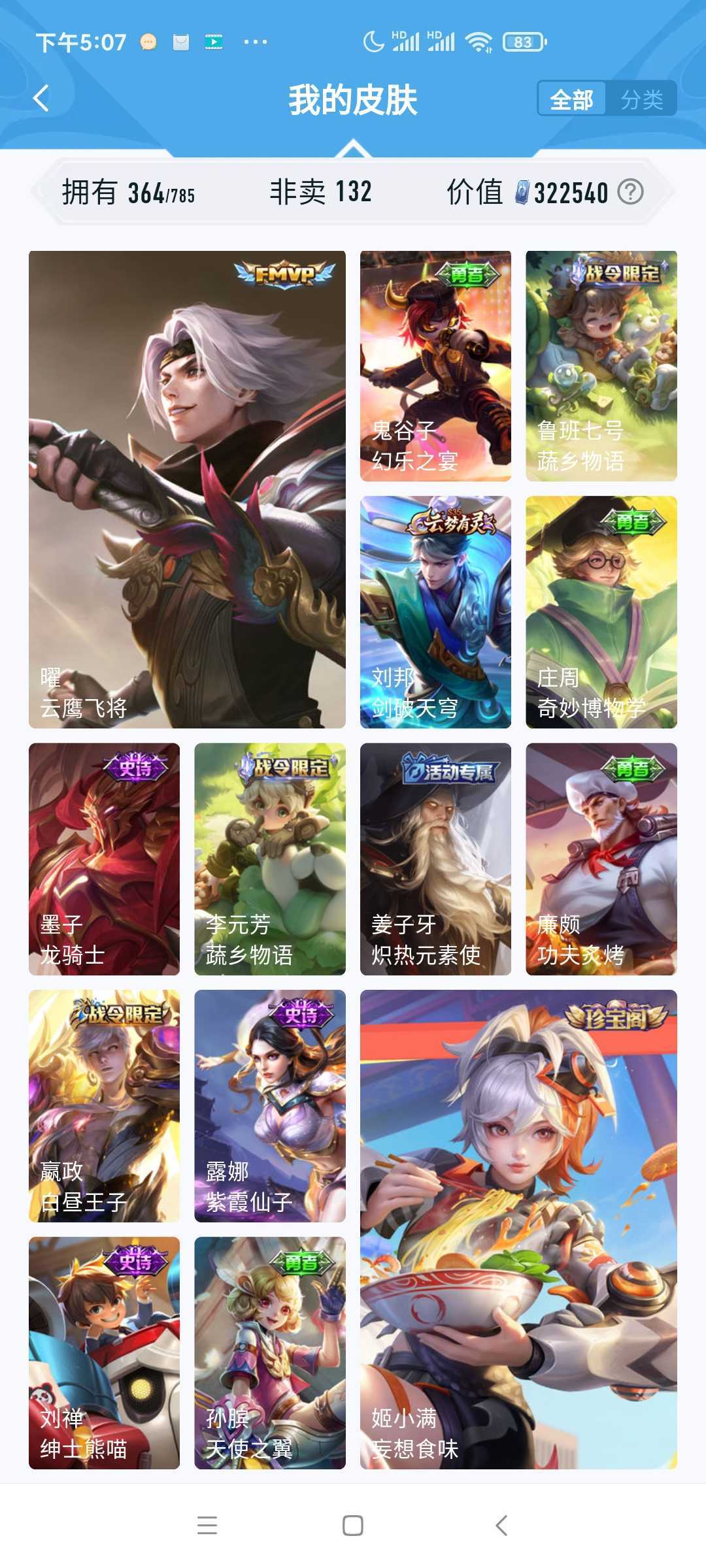 v10、537皮6水4无双、安琪拉-颠倒童话·魔镜、朵莉亚-神骥、遇见神鼓、齐天大圣、白虎志、韩信荣耀典藏、73传说、时之魔女、瑶无双、青丘、九尾、神器明辉仪