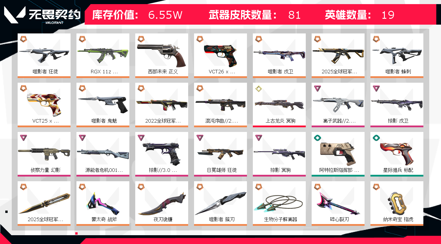 郑重声明: !!!!!因无畏契约检测严格,为防止后台插件导致封号,请务必重启电脑!!!!本人商户多年,所属账号已在派出所备案,若出现账号封禁/毁号等情况,会马上与平台联系,平台会报警处理!请租客文明游戏,不要开挂或挂机! 1.请勿使用第三方软件/插件/外挂◇平台检测到会直接完单。2.登陆界面稍等2分钟会上去(自动登录)老板不要着急,一次不行多来几次wegame界面要耐心等2分钟 3..密令会自动输入如果一次不成功多来几次 4.请及时续租不要挂机,到时不下线,但是下一个会挤号导致挂机,所以请及时续租,导致禁赛的一律拉黑 5.祝老板玩的愉快,喜欢可以收藏关注!开挂必追究,不拿到赔偿不罢休! 如果上号正在游戏中,是上个租客到时不下线导致的,不是顶号,请帮忙打完这局,谢谢了。 时间到了建议续租,打完撤单,为了防止顶号,请您及时续租获得更好的游戏体验;掠影 戍卫,噬影者 狂徒,侦察力量 幻影,RGX 11z Pro 狂徒,离子武器//2.0 狂徒,西部未来 正义,
