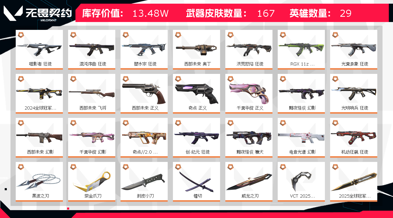 账号已备案,【禁】开挂,封号必【究】 下单前请查看段位是否是自己想要的 喜欢请【收藏】,随时有打折~ 【拥有套装】2022全球冠军赛套装(2022全球冠军赛-幻影,2022全球冠军赛-蝴蝶刀)千灵华绽//2.0套装(千灵华绽//2.0-狂徒,千灵华绽//2.0-战神,千灵华绽//2.0-莽侠,千灵华绽//2.0-鬼魅,流风回雪)西部未来套装(西部未来-幻影,西部未来-奥丁,西部未来-飞将,西部未来-正义,未来开拓者)2025全球冠军赛套装(2025全球冠军赛-狂徒,2025全球冠军赛-蝴蝶刀 )2024全球冠军赛套装(2024全球冠军赛-幻影,2024全球冠军赛-战刀) 【拥有近战武器】蒙太奇-战斧,碎心裂刃,星际猎兵-短剑,阿特拉斯指挥部-甩棍,日耀风暴-遗器,诡秘蛇影-军刀,VCT-2025-爪刀,神圣领域-战刀,超能偶像-应援棒,超时空卫队-三棱军刺,影钩,嘟昂嘟昂超弹力水球拳套,神之刃,镭切,落英飞旋,黑波之刃,紫金爪刀,天玄刀,天御刀,剥皮小刀,威龙之刃,魔术火花, 【拥有步枪】光荣异象-狂徒,RGX-11z-Pro-狂徒,电音光谱-幻影,噬影者-狂徒,创·纪元-狂徒,光明哨兵-狂徒,混沌序曲-狂徒,千灵华绽-幻影,黯夜怪谈-幻影,黯夜怪谈-獠犬,洪荒怒焰-狂徒,塑水宗-狂徒,奇点//2.0-狂徒,机动狂飙-狂徒,超时空卫队-狂徒,781-A协议-獠犬,艾沃莉的梦之翼-狂徒,紫阙金琅-狂徒,紫阙金琅-戍卫,盖亚的复仇-狂徒,侦察力量-幻影,冰点凝冻-狂徒,日冕雄师-狂徒,掠影-戍卫,掠影-狂徒,蒙太奇-幻影,幻心猎手-狂徒,星际猎兵-幻影,阿特拉斯指挥部-狂徒,日耀风暴-幻影,诡秘蛇影-狂徒,神圣领域-獠犬,神圣领域-幻影,超能偶像-戍卫,超能偶像-狂徒,超集系统-狂徒,风暴之子-戍卫,甜心猎手-幻影,甜心猎手-戍卫,诛心猎手-獠犬,瑰梦艺语-狂徒,光环序列-戍卫,悠闲猫生-獠犬,太空穿梭-戍卫,悠闲猫生-幻影,幻语魔咒-獠犬,甜蜜战术-戍卫,末日之翼-幻影,折光棱晶-戍卫,月球哨兵-戍卫,采蜜小蜂队-獠犬,聚合之力-幻影, 【拥有狙击枪】千灵华绽-冥驹,堕天遗武-冥驹,起源-冥驹,星际猎兵-飞将,阿特拉斯指挥部-莽侠,诡秘蛇影-莽侠,风暴之子-冥驹,超集系统-飞将,诛心猎手-冥驹,甜心猎手-莽侠,光环序列-冥驹,悠闲猫生-飞将,甜蜜战术-冥驹,幻语魔咒-飞将,末日之翼-飞将,星云暗涌-冥驹,月球哨兵-莽侠,聚合之力-飞将, 【拥有机枪】蒙太奇-战神,日耀风暴-奥丁,神圣领域-战神,诛心猎手-奥丁,光环序列-战神,太空穿梭-战神,末日之翼-奥丁,采蜜小蜂队-战神, 【拥有冲锋枪】塑水宗-骇灵,蒙太奇-骇灵,阿特拉斯指挥部-骇灵,日耀风暴-骇灵,甜心猎手-蜂刺,瑰梦艺语-骇灵,折光棱晶-蜂刺,星云暗涌-骇灵,星云暗涌-蜂刺,聚合之力-蜂刺, 【拥有霰弹枪】星际猎兵-判官,诡秘蛇影-判官,超能偶像-判官,风暴之子-雄鹿,瑰梦艺语-雄鹿,太空穿梭-判官,甜蜜战术-判官,幻语魔咒-雄鹿,月球哨兵-雄鹿,采蜜小蜂队-判官, 【拥有手枪】VCT25-x-PRX-标配,电音光谱-标配,千灵华绽-正义,奇点-正义,紫阙金琅-标配,耀鳞威龙-鬼魅,蒙太奇-狂怒,幻心猎手-鬼魅,星际猎兵-标配,阿特拉斯指挥部-标配,日耀风暴-正义,诡秘蛇影-鬼魅,神圣领域-狂怒,超能偶像-标配,超集系统-标配,风暴之子-正义,诛心猎手-正义,甜心猎手-短炮,光环序列-狂怒,瑰梦艺语-鬼魅,悠闲猫生-短炮,太空穿梭-正义,甜蜜战术-鬼魅,幻语魔咒-狂怒,末日之翼-短炮,折光棱晶-标配,星云暗涌-鬼魅,月球哨兵-正义,聚合之力-狂怒,采蜜小蜂队-鬼魅, 【稀有挂件】V25第六幕黄金挂饰,糖饼先生挂饰,千灵华绽20挂饰,V25第三幕黄金挂饰,危化小分队小麦挂饰,危化小分队小黑挂饰,春节吉祥结挂饰,第九季白银挂饰,超能偶像挂饰,采蜜小蜂队挂饰,袖珍捷风挂饰,2024全球冠军赛挂饰,糖葫芦挂饰,迷你浓缩挂饰, 【卡面信息】糖饼惊喜卡面,千灵华绽20卡面,危化小分队双双受困卡面,危化小分队差点玩完卡面,噬影者卡面,西部未来卡面,先驱者卡面,VCT2025CN联赛卡面,超能偶像卡面,;西部未来 奥丁,黑波之刃,紫金爪刀,剥皮小刀,镭切,威龙之刃,VCT 2025 爪刀,