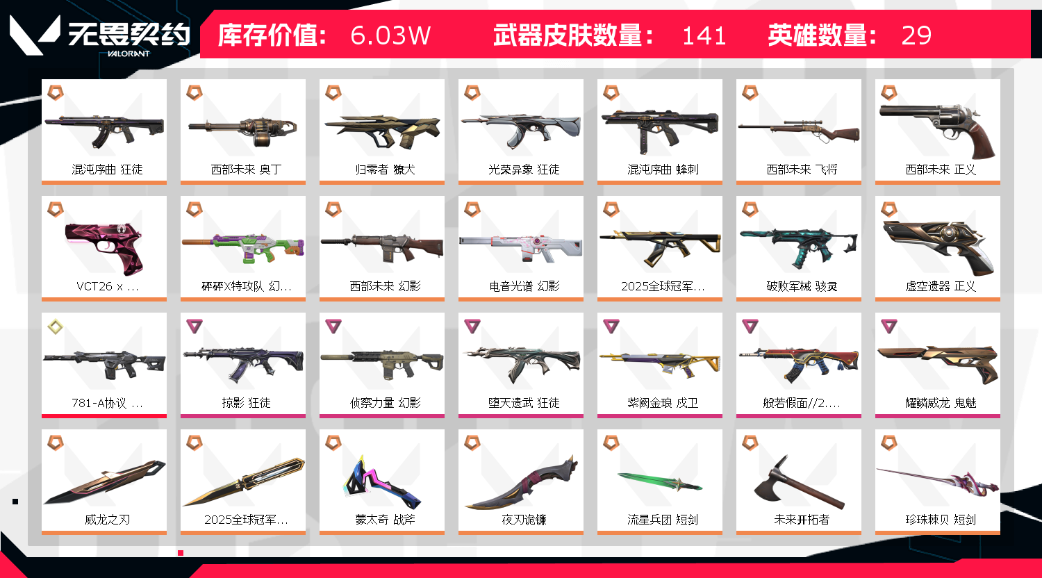 首页 > 租号大厅 > 无畏契约-wegame > wegame/wegame > 六万库存丨全毕业枪皮丨混沌、侦查丨12把主战丨8近战丨允许排位丨全英雄