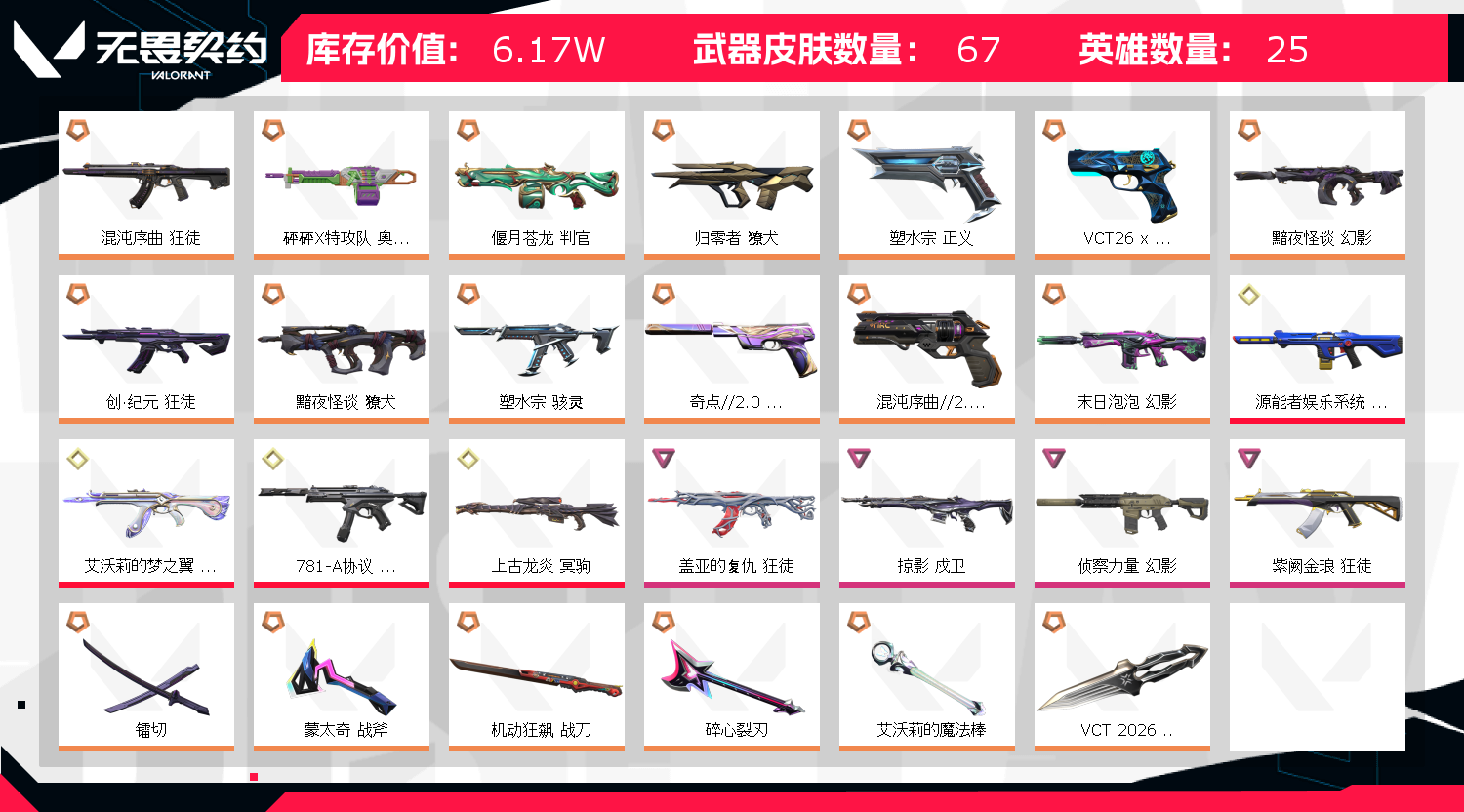 首页 > 租号大厅 > 无畏契约-wegame > wegame/wegame > 精品库存6w库青铜号💖26vct篆刀💖全单买紫金混沌猫猫ak💖hang神同款