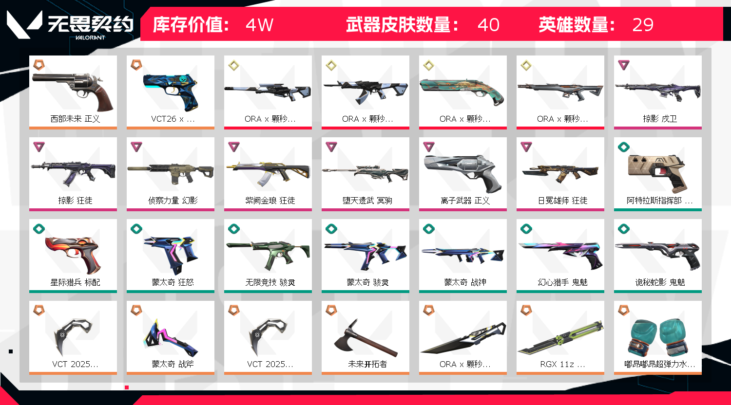 首页 > 租号大厅 > 无畏契约-wegame > wegame/wegame > VCT篆刀✨颗秒套✨VCT爪✨滋滋拳✨显卡蝴蝶✨西部✨掠夺✨侦查✨离子✨弃王✨雄狮✨紫金