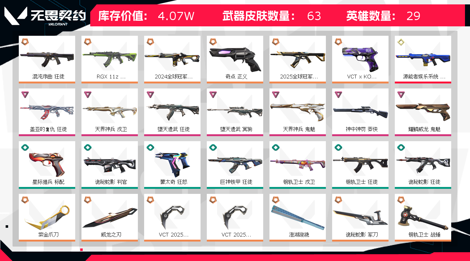 首页 > 租号大厅 > 无畏契约-wegame > wegame/wegame > 可排位 英雄29 武器皮肤数量63
