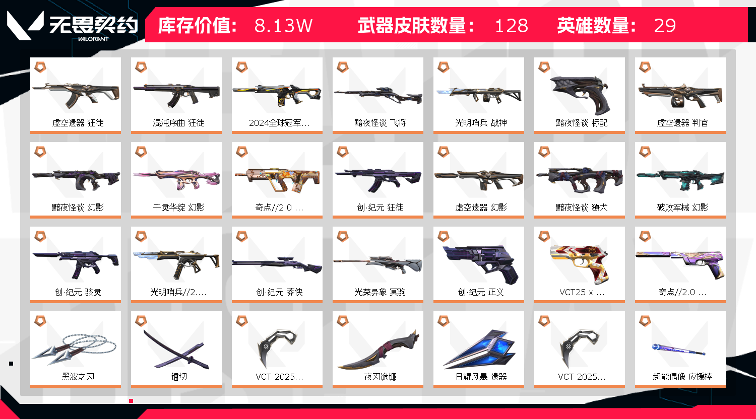 8.1万库存,虚空,创纪元,24冠军,黯夜,奇点,其他看图 开挂必究;黑波之刃,镭切,VCT 2025 爪刀,起源 雄鹿,盖亚的复仇 狂徒,虚空遗器 狂徒,异鳞魔蛇 幻影,