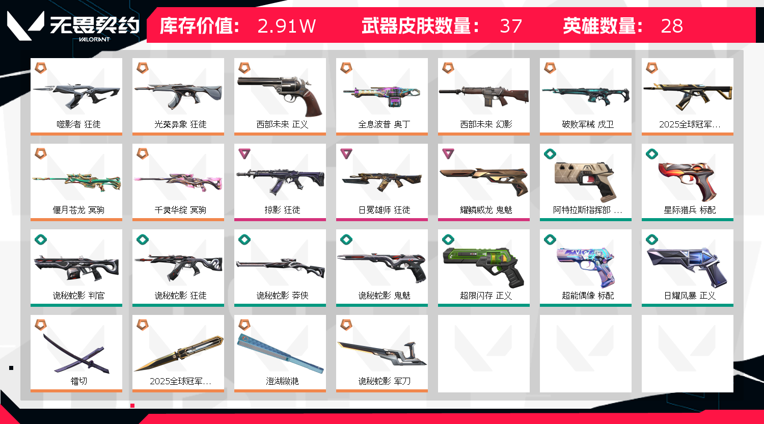 允许 英雄28 武器皮肤数量37 25冠军套;镭切,噬影者 狂徒,掠影 狂徒,光荣异象 狂徒,西部未来 正义,