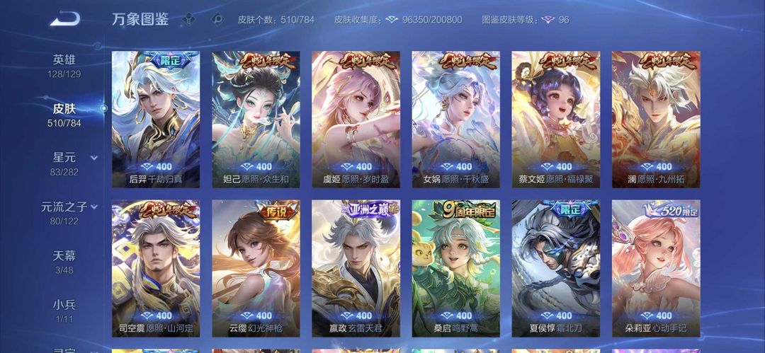 v10、537皮6水4无双、安琪拉-颠倒童话·魔镜、朵莉亚-神骥、遇见神鼓、齐天大圣、白虎志、韩信荣耀典藏、73传说、时之魔女、瑶无双、青丘、九尾、神器明辉仪