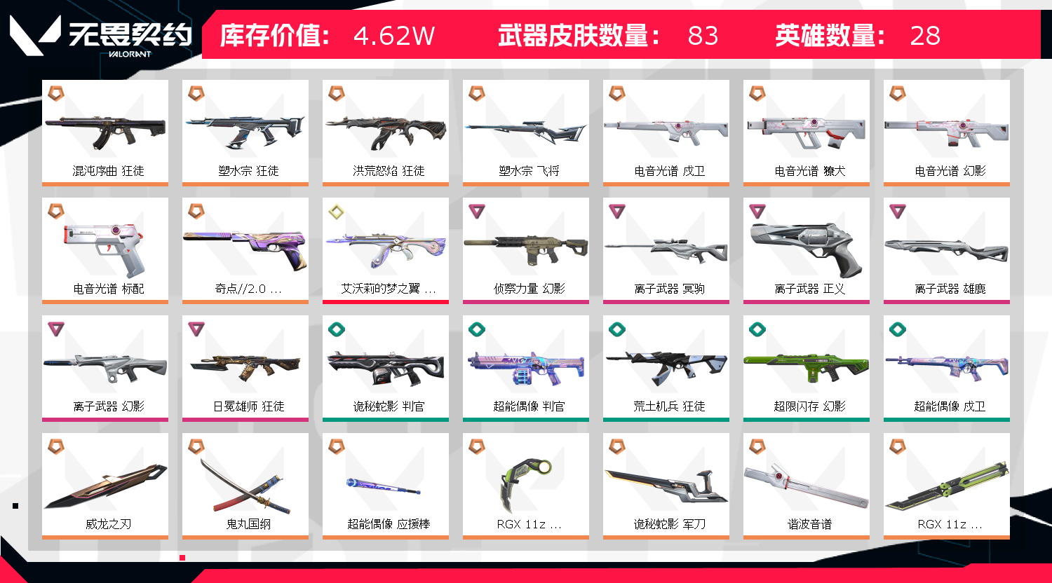 英雄28 武器皮肤数量83;威龙之刃,洪荒怒焰 狂徒,侦察力量 幻影,混沌序曲 狂徒,塑水宗 狂徒,塑水宗 飞将,离子武器 冥驹,