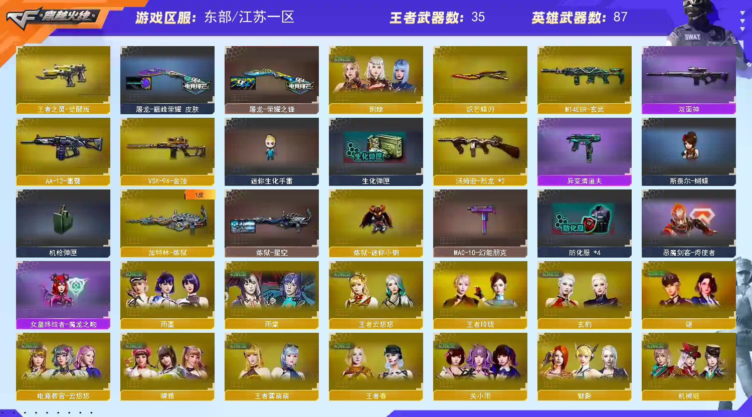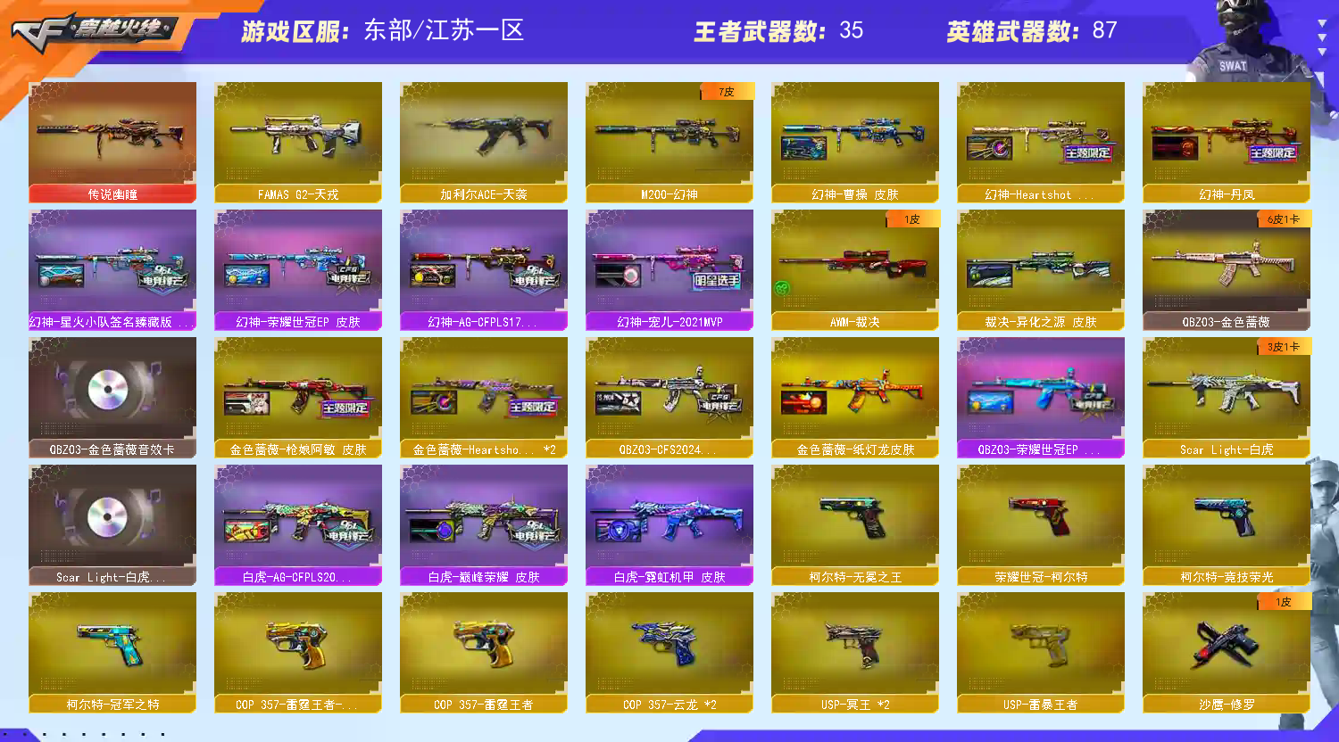 传说幽瞳】【M200-幻神+曹操+heartshot+幻神-丹凤+荣耀世冠ep+幻神-宠儿+幻神-AG-CFPLS17+幻神星火小队】【竞技荣光套+云悠悠+usp雷暴】【王者幻神】【王者星霆】【白虎之魄】【王者白虎】【ScarLight-白虎+音效卡+巅峰荣耀】【QBZ03-金色蔷薇+音效卡+heartshot+cfs2024+纸灯龙+荣耀世冠ep】【小人枪 Kar98K-星神炽天使】【生化 炼狱 2烈龙 迷你小钢 蝴蝶 死亡之眼】【裁决+裁决-异化之源】【Barrett-毁灭+音效卡+枪娘+heartshot】【极光+音效卡】【荣耀世冠套】【加利尔天袭】【天戎】【AK47-火麒麟+音效卡+heartshot】【黑龙+音效卡+黑龙-冠军之武】【M4A1-雷神+音效卡+heartshot+巅峰荣耀+雷神-传奇n9+雷神-冠军之魄】【黑骑士+音效卡+黑骑士-马超】【王者之鲨 王者火魄 王者之烈 王者龙血 青龙之魄 王者之光 王者森决】【无影 死神 黑武士 天启 超新星 hk417-朱雀+音效卡 天罚+音效卡】【11手枪 修罗 竞技荣光 usp冥王*2 cop云龙*2 柯尔特无冕之王 王者之灵 荣耀世冠-柯尔特 cop雷霆王者 柯尔特-冠军之特】【10近战 屠龙 龙啸 擎天*2 麒麟刺*2 炽芒蝶刃蝴蝶刀 云龙扇】【手雷 竞技荣光 云龙雷】【四防 晴雅 王者春 王者雾萌萌 王者云悠悠 王者炫】【ScarLight-白虎音效卡 QBZ03-金色蔷薇音效卡 黑骑士音效卡 AK47-火麒麟音效卡 极光音效卡 M4A1-雷神音效卡;柯尔特-无冕之王,USP-雷暴王者,荣耀世冠-柯尔特,柯尔特-冠军之特,炽芒蝶刃,电竞教官-云悠悠,晴雅,