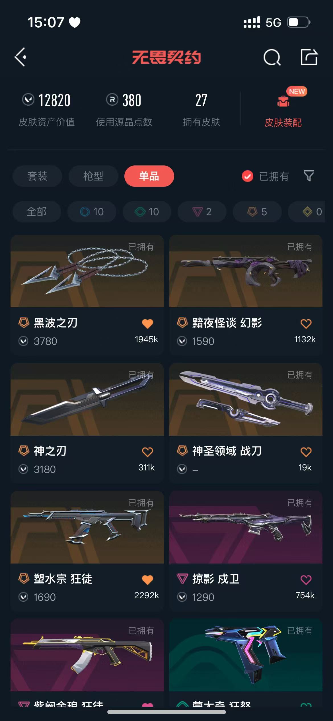 英雄28 武器皮肤数量27;黑波之刃,掠影 戍卫,紫阙金琅 狂徒,塑水宗 狂徒,