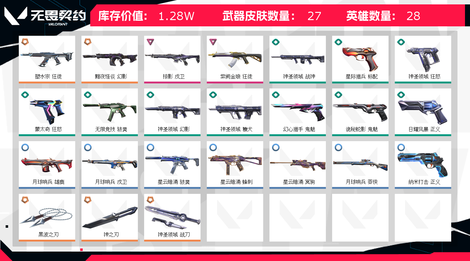 首页 > 租号大厅 > 无畏契约-wegame > wegame/wegame > ⚡冻结点申请协助在线秒解冻⚡英雄28 武器皮肤数量27
