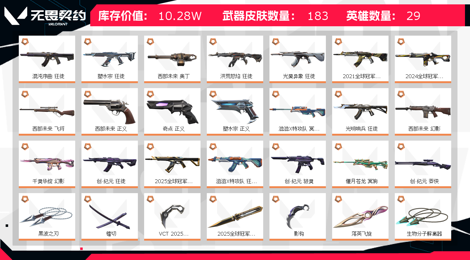 首页 > 租号大厅 > 无畏契约-wegame > wegame/wegame > 10w大库存21冠军22冠军套西部套掠影套