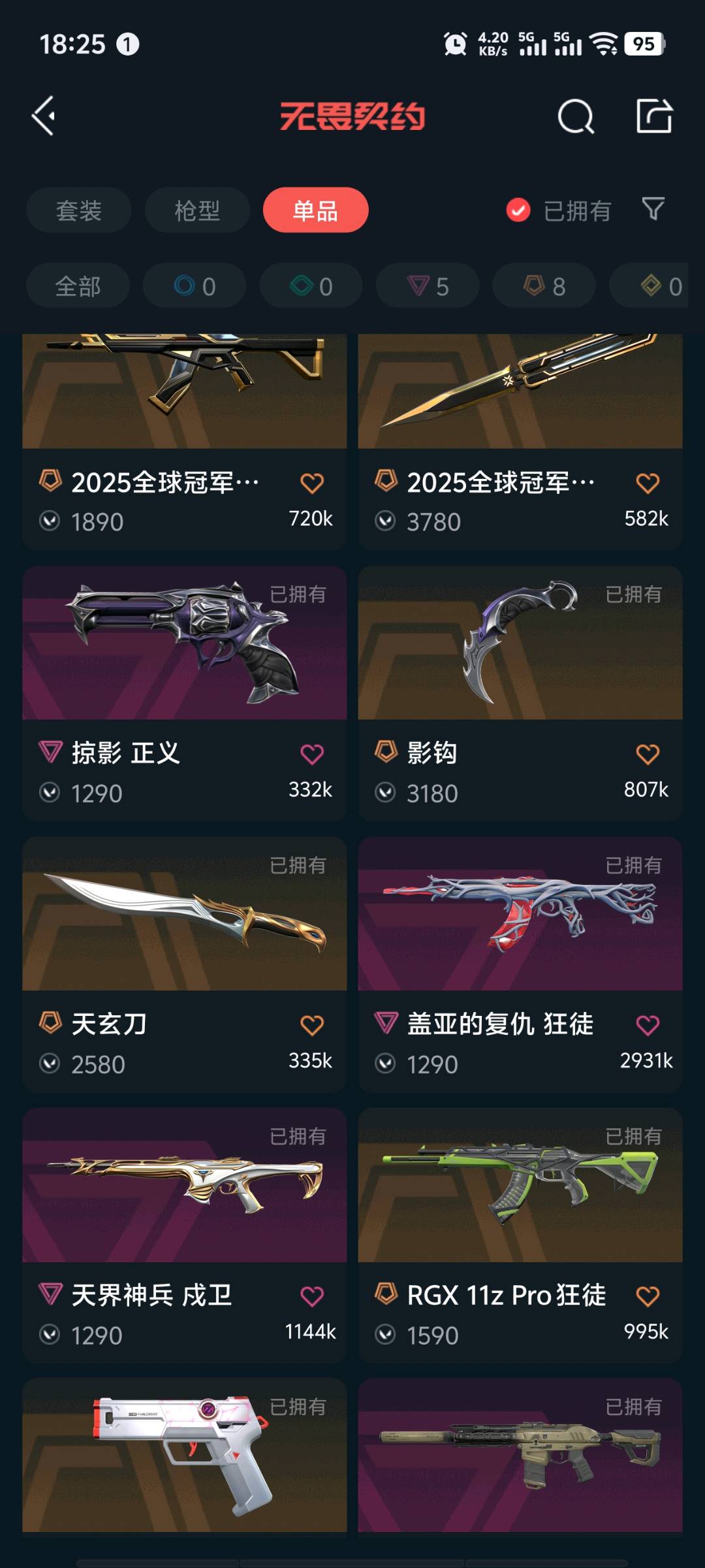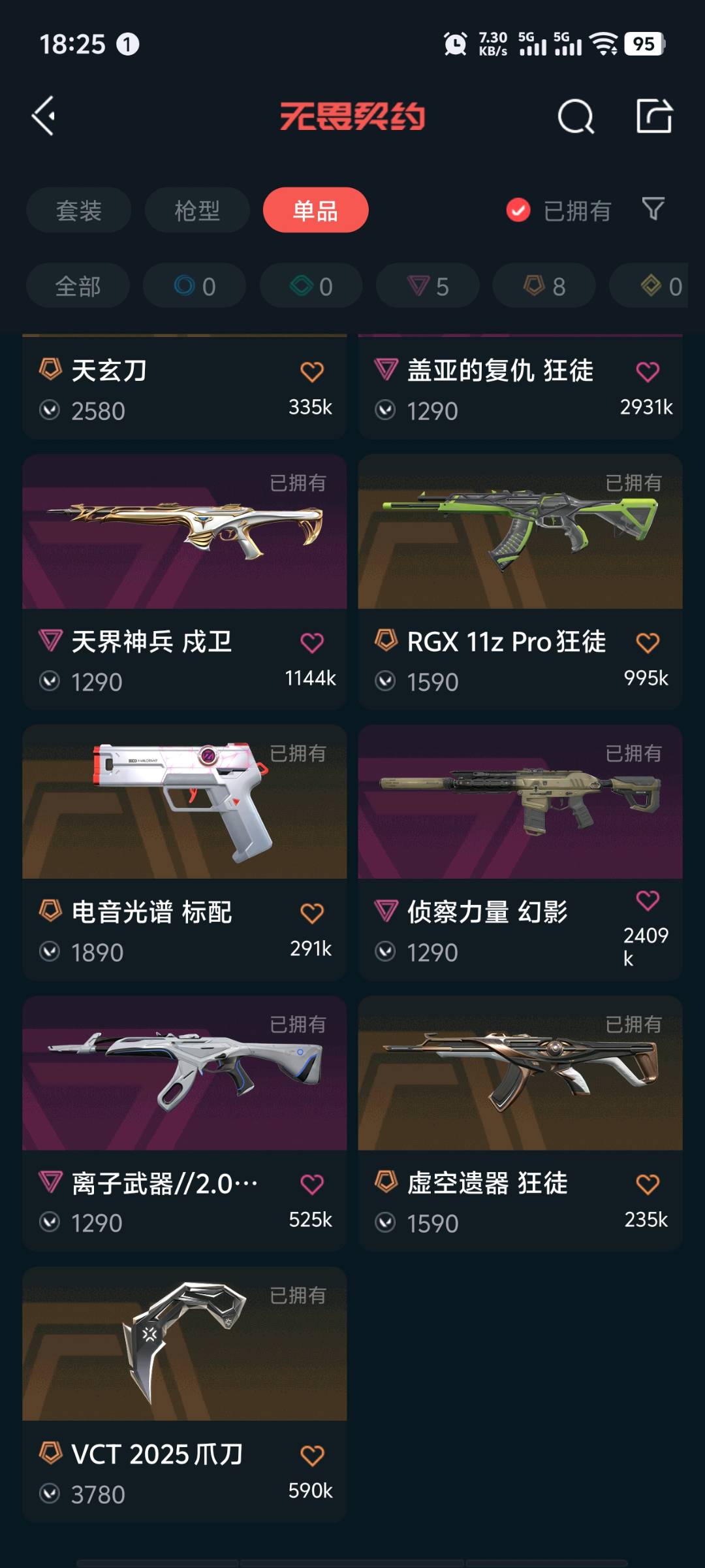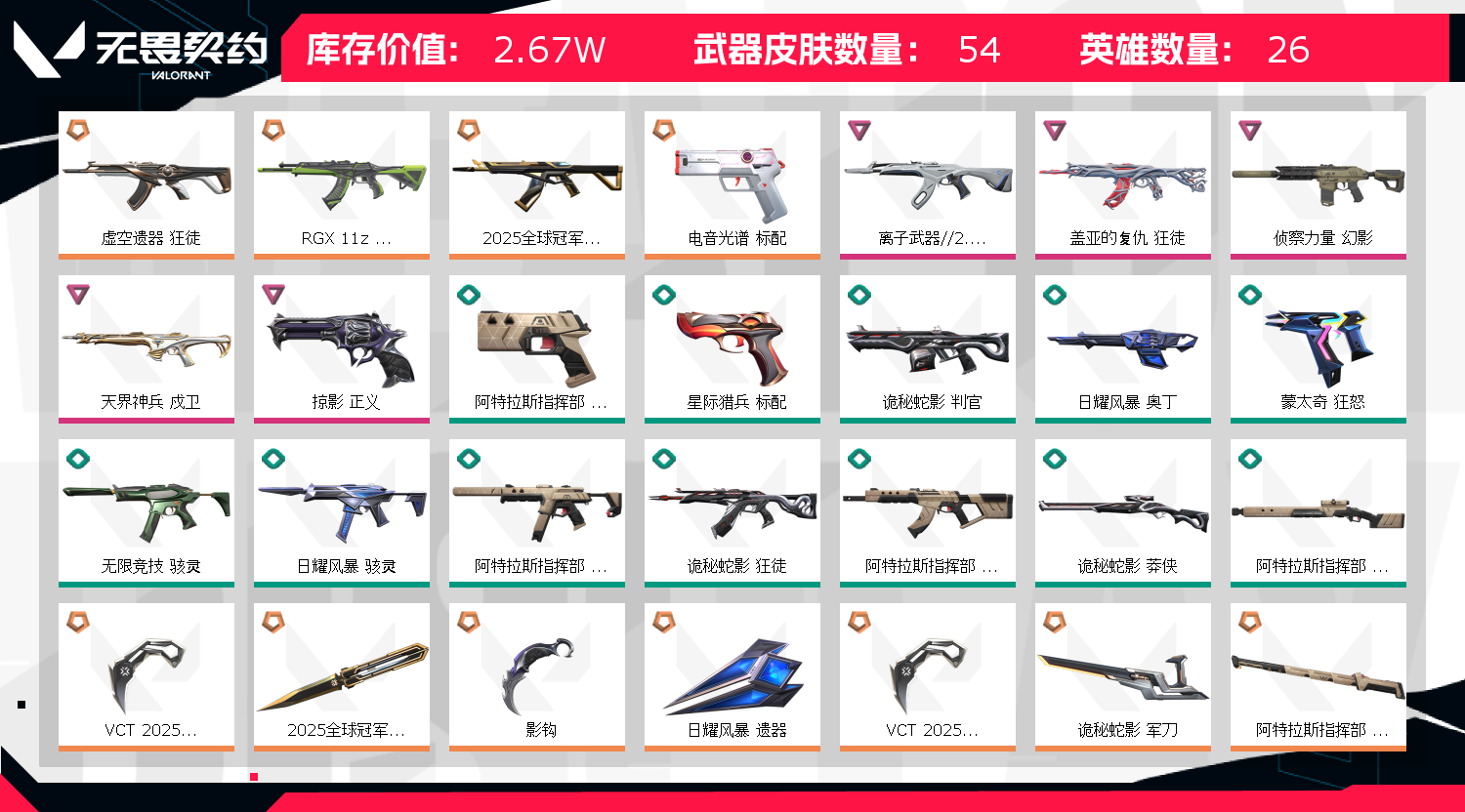 允许 英雄25 武器皮肤数量54;VCT 2025 爪刀,盖亚的复仇 狂徒,虚空遗器 狂徒,侦察力量 幻影,RGX 11z Pro 狂徒,天界神兵 戍卫,离子武器//2.0 狂徒,