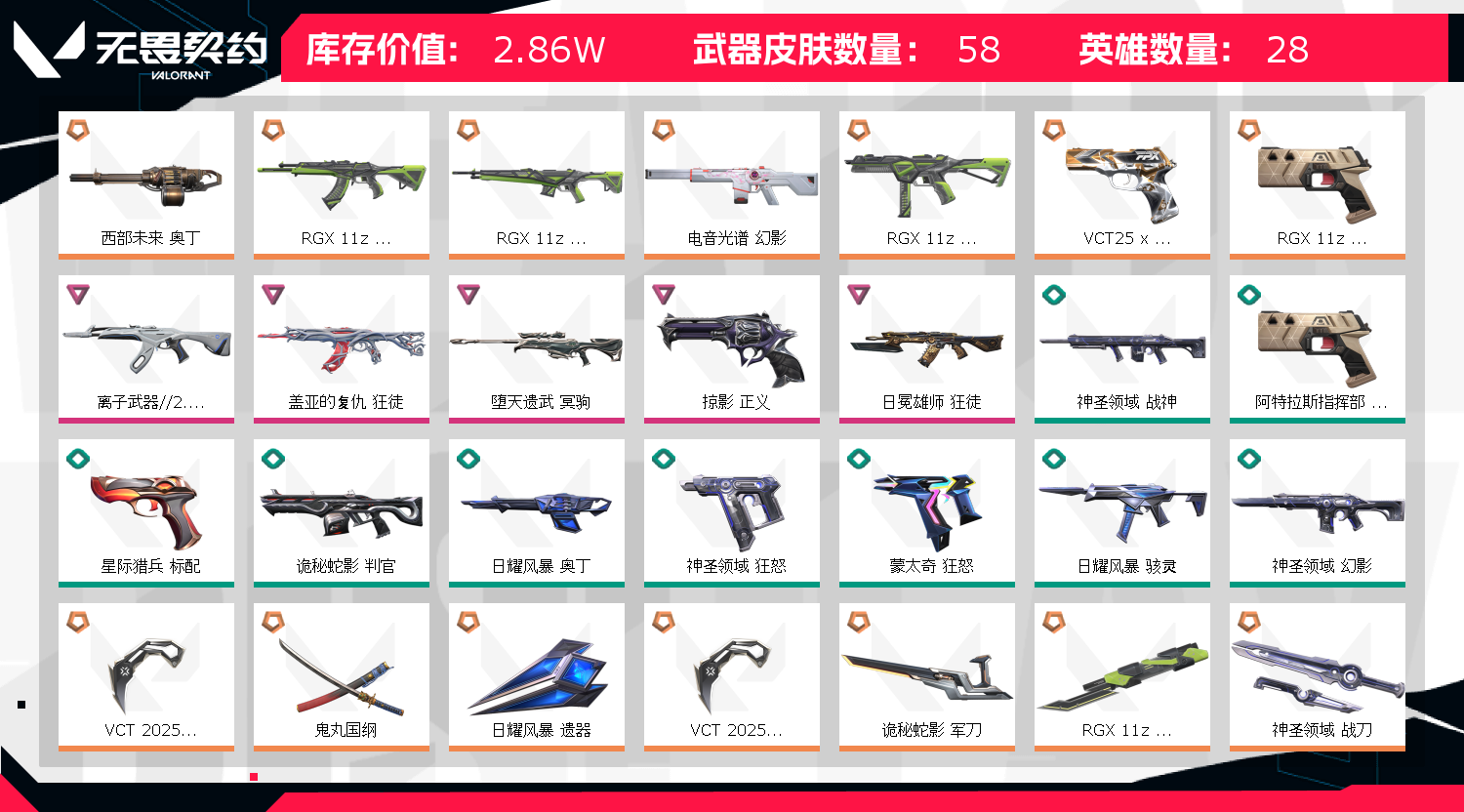 禁止开挂,消极比赛,违规必追;西部未来 奥丁,VCT 2025 爪刀,盖亚的复仇 狂徒,RGX 11z Pro 狂徒,离子武器//2.0 狂徒,堕天遗武 冥驹,掠影 正义,
