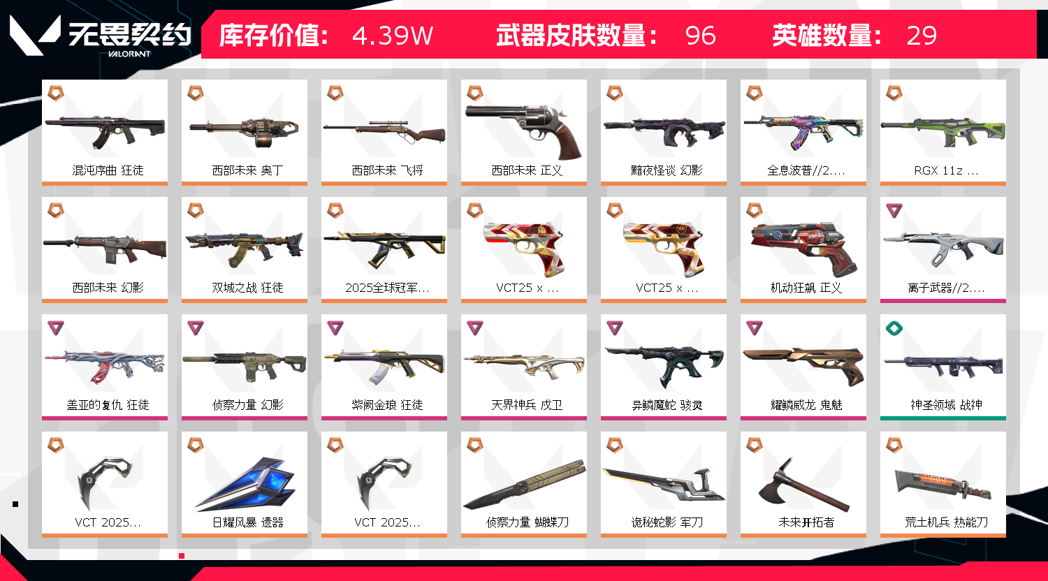 挂机中途退出永久冻结账户!!!!自动解冻!!!控制kd30以下!!!zha鱼封号拉黑!!!祝您游戏愉快!!!生活愉快!!!;西部未来 奥丁,VCT 2025 爪刀,盖亚的复仇 狂徒,侦察力量 幻影,紫阙金琅 狂徒,天界神兵 戍卫,混沌序曲 狂徒,