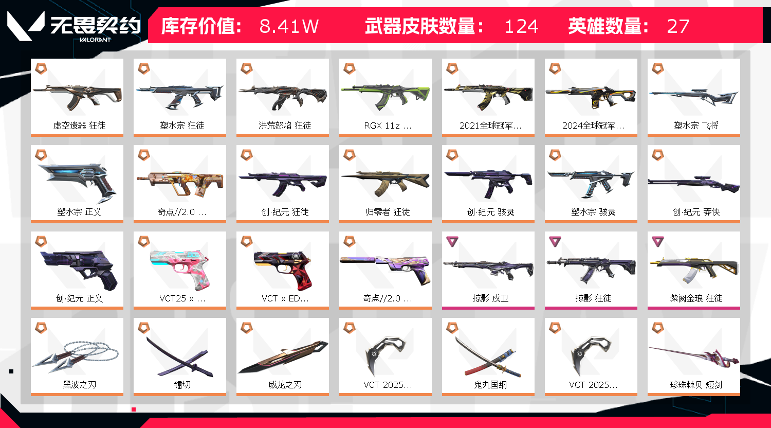 可排位21.22冠军套,神化标,流脓显卡虚无ak冠军恶鬼m4,vct爪刀,显卡蝴蝶,怜悯之刃;黑波之刃,镭切,威龙之刃,VCT 2025 爪刀,虚空遗器 狂徒,掠影 戍卫,洪荒怒焰 狂徒,