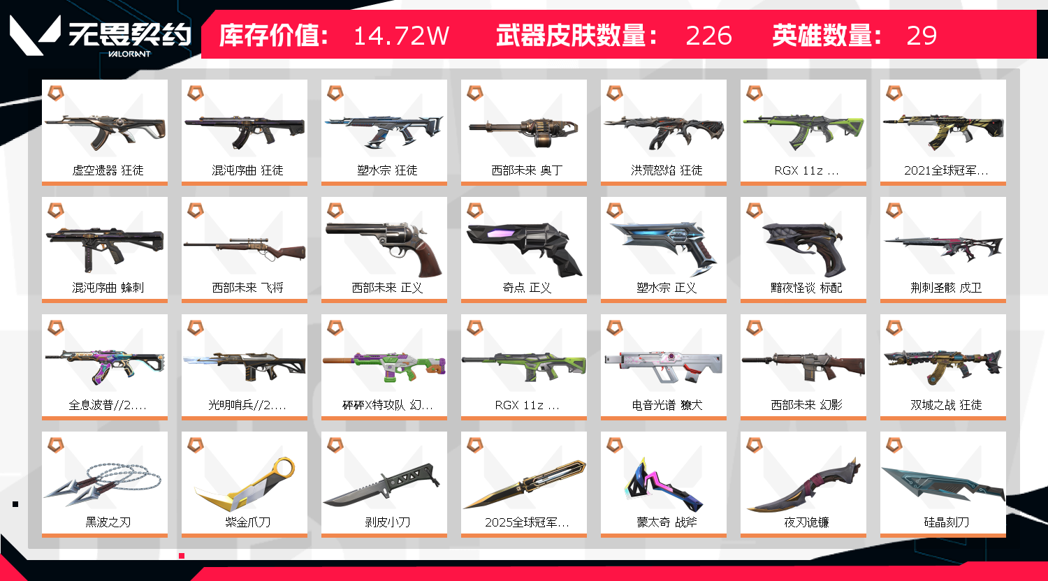 15w库存❤️21-25冠军套❤️三棱军刺❤️双城❤️黑波❤️西部未来❤️荆刺圣骸❤️猫猫ak;西部未来 奥丁,黑波之刃,紫金爪刀,剥皮小刀,上古龙炎 判官,盖亚的复仇 狂徒,虚空遗器 狂徒,