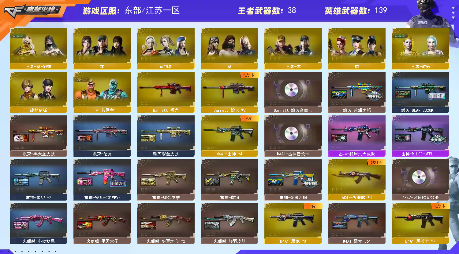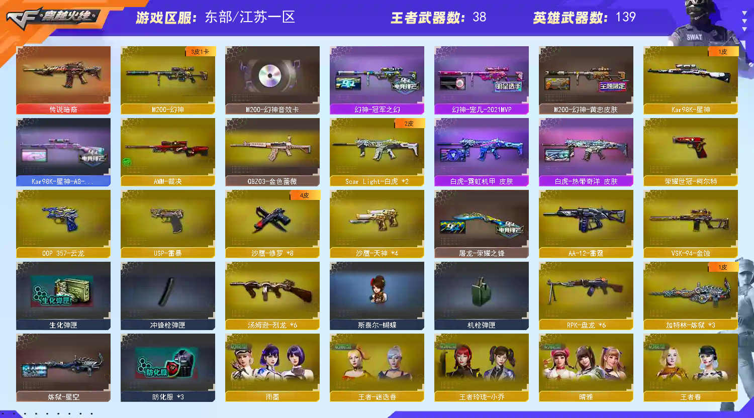 【幻神3件套!!!】【m200幻神+幻神音效卡+宠儿皮肤+冠军之幻皮肤+黄忠皮肤+usp雷暴】【王者幻神】【98k星神+ag冠军皮肤】【传说暗裔】【白虎*2+霓虹机甲皮肤+王者白虎】【qbz03金色蔷薇】【qbz03天罚+天罚音效卡】【金蚀】【6盘龙+2炼狱+6烈龙+斯泰尔蝴蝶】【6黑骑士】【雷暴套装】【云龙套装】【荣耀世冠套装】【雷神+雷神音效卡+宠儿皮肤+荣耀之魄皮肤】【毁灭+毁灭音效卡+荣耀之怒皮肤+ag冠军皮肤+sv冠军皮肤】【火麒麟+火麒麟音效卡】【黑骑士+黑骑士音效卡+冠军之势皮肤】【王者冰魄 王者之心 王者之魄 王者之势 王者之烈 王者之光 王者之决 王者之力 王者之怒】【烈火 天启 常胜将军 身先士卒 战神 黑鲨 黑龙 无影 龙血 黑骑士海王 黑武士 黑武士锦绣游龙 超新星热带奇洋 天龙 极光 芭蕾特朱雀 裁决 aa12雷霆】——【热门武器/小人呛】【火麒麟灵狐 天龙曼陀罗 炽火炎龙 斯泰尔蝴蝶 】——【usp雷暴 cop云龙 荣耀世冠柯尔特 天神*4 修罗*7】——【龙啸 龙啸热带奇洋 麒麟刺 擎天 荣耀世冠龙啸 屠龙 王者之锋 王者之击 斩神刀雷暴 王者之啸 云龙扇 】——【雷暴投掷武器套装*5+雷霆王者投掷武器套装+云龙投掷武器套装*5】——【角色】【4防(王者春 王者葵貂蝉 王者魅影 王者迷迭香 王者玲珑小乔 灵狐者职业经理 )】【晴雅 雨墨 葵 零 审判者 樱】;USP-雷暴,荣耀世冠-柯尔特,晴雅,RPK-盘龙,QBZ03-金色蔷薇,M200-幻神,Scar Light-白虎,