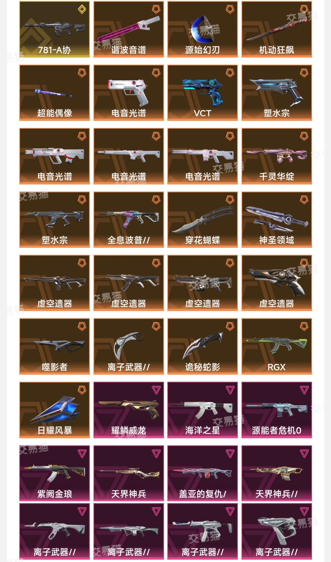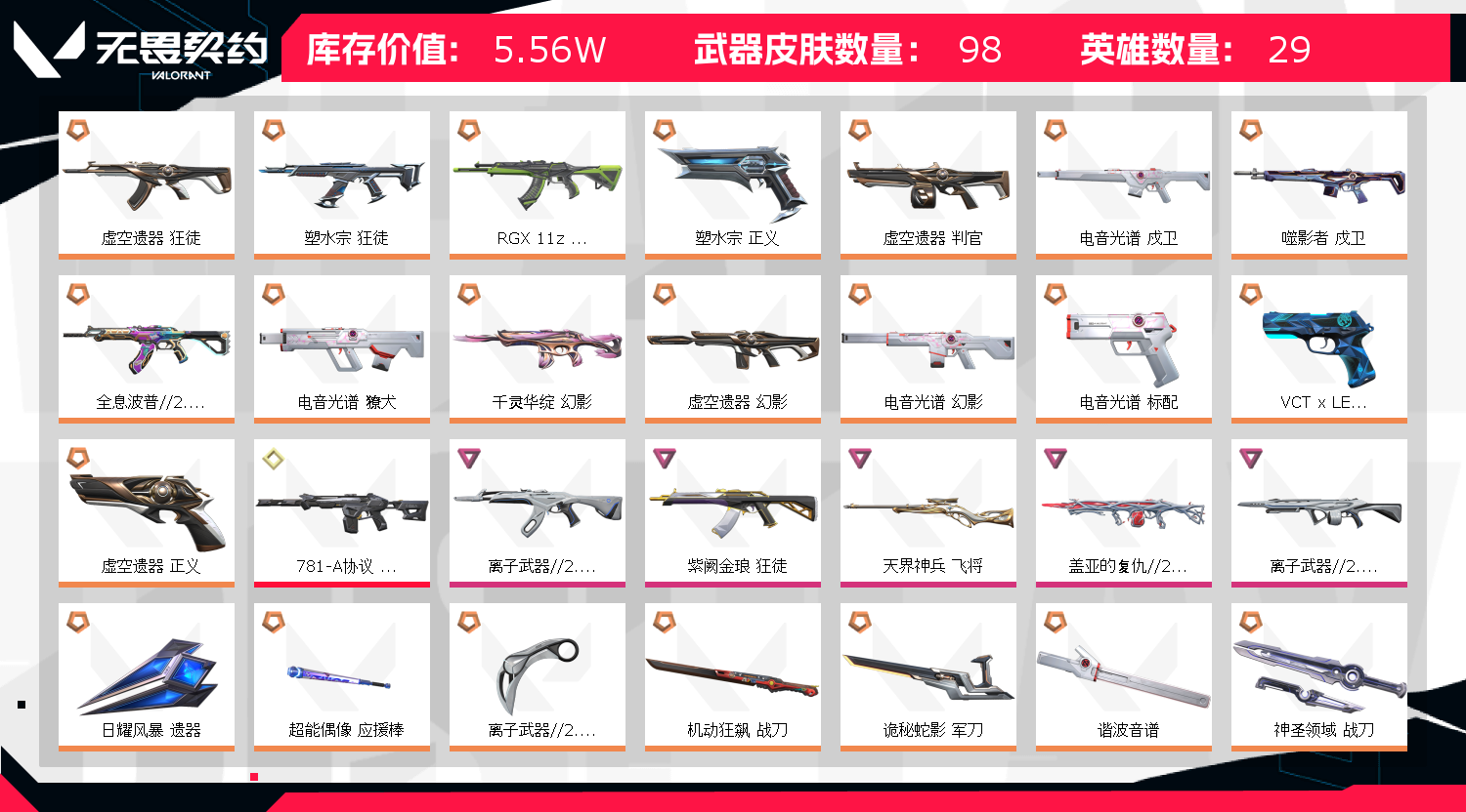 禁止炸鱼 谢谢 离子武器2.0套 电音光谱套 虚空遗器套 机动狂飙战刀 穿花蝴蝶 塑水宗狂徒正义 电音光谱谐波音谱戍卫电音光谱 噬影者戍卫 显卡狂徒 天界神兵飞将奥丁 全息波普狂徒 海洋之星狂徒 紫阙金琅狂徒 耀鳞威龙鬼魅 vct标配 能源者危机幻影;