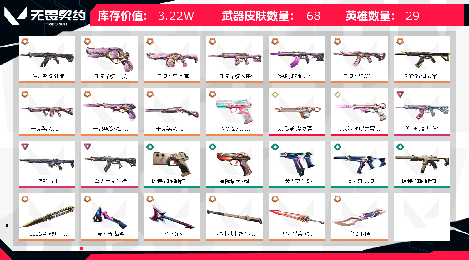 英雄29 武器皮肤数量68;艾沃莉的梦之翼 奥丁,盖亚的复仇 狂徒,掠影 戍卫,洪荒怒焰 狂徒,堕天遗武 狂徒,千灵华绽 正义,