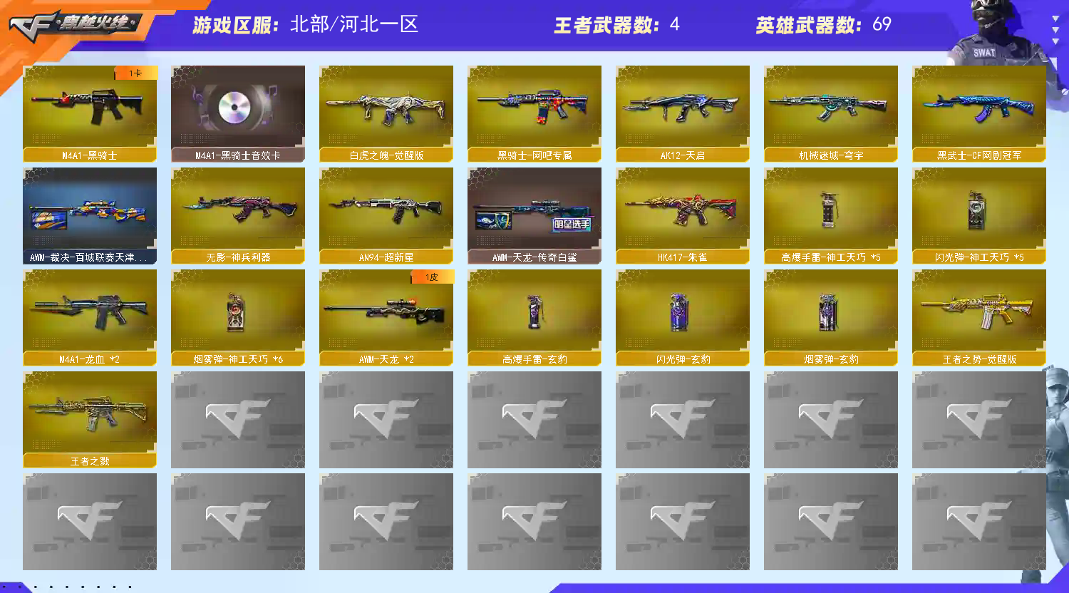 此账号和平台属于合作关系,已经备案。如果账号封号或者什么的,商户将会协助平台然后报警。 收藏好评!由于异地登录保护机制,部分客户在使用客户端自动上号时会出现密码错误,注意本号密码不会错误,请多尝试5-6次!本账号已经过虚拟财产-认1证。请素质租号,文明游戏,谢谢大家配合!!!;柯尔特-荣耀世冠白鲨2023,柯尔特-冠军之特,RPK-盘龙,QBZ03-金色蔷薇,G36C-幻影,M200-幻神,