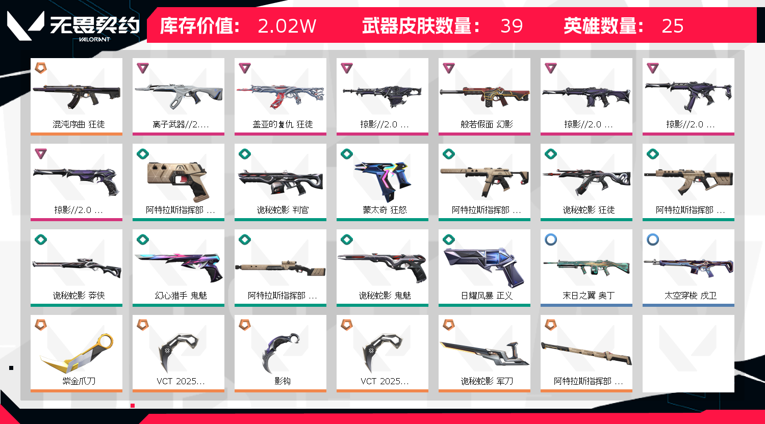2W库存⚡掠夺2.0套装⚡25VCT爪刀⚡离子狂徒⚡混沌狂徒⚡紫金爪刀⚡般若幻影⚡盖亚狂徒