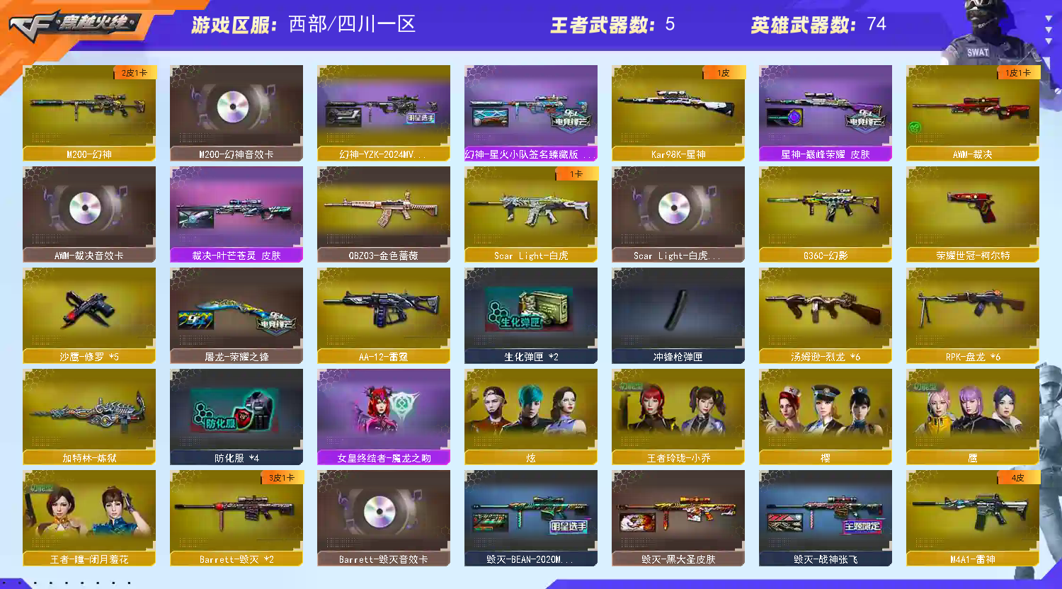 HK417-朱雀,金色小号,加特林-炼狱,Kar98K-星神,M4A1-青龙,M200-幻神,M4A1-黑骑士,QBZ03-金色蔷薇,荣耀世冠-柯尔特,RPK-盘龙,Scar Light-白虎,死亡之眼,沙鹰-修罗,汤姆逊-烈龙【王者炫金武器】:王者之翼,炫金骑士,炫金天龙,王者之魄闪光弹【音效卡】:Scar Light-白虎,AWM-裁决,M200-幻神,AK47-火麒麟,M4A1-黑骑士,Barrett-毁灭,M4A1-雷神【皮肤】:AK47-黑武士-361,毁灭-黑大圣,幻神-星火小队签名臻藏版,火麒麟-华夏之心,火麒麟-轻羽,火麒麟-战神关羽,火麒麟-平天大圣,毁灭-战神张飞,毁灭-BEAN-2020MVP,雷神-荣耀之魄,雷神-虎将,屠龙-荣耀之锋,幻神-YZK-2024MVP,星神-巅峰荣耀,火麒麟-雷神,黑龙-暗月【角色】:蜀雪,王者-瞳-闭月羞花,王者玲珑-小乔,炫,樱,鹰,樱-青春偶像,暗夜-X,初恋灵狐,芳心审判者,风暴女,娟娟,灵狐者-黄金海岸,龙儿-小淘气,潘多拉-X,潘多拉-甜心教官【人偶武器】:夺魂,高爆手雷-大乔,火麒麟-灵狐,迷你深渊冰龙,迷你牛魔王,生化手雷-机甲核心,深渊终结者手雷,闪光弹-小乔,闪光弹-貂蝉【暴走生化】:超级对讲机,死亡之眼【挑战大师】:AK47-冰龙粉碎者,激光毁灭者III,神圣爆裂者-末日III【英雄级武器】:9A91-烈火,AK47-火麒麟,AK12-天启,AK47-黑鲨,AWM-裁决,AA-12-雷霆,Barrett-毁灭,加特林-炼狱,Kar98K-星神,M4A1-黑龙,M4A1-雷神,M4A1-黑骑士,M4A1-龙血,M4A1-玫瑰精灵,M200-幻神,麒麟刺【源级武器】:源-千变,源·火麒麟,魂·火麒麟-百城,火麒麟-雷神,御·黑龙-龙太子,源·雷神,魂·M4A1-雷神-化蛇,魂·雷神-神秘按键,御·雷神-机甲刑天,雷神-赛博朋克,御·雷神-小白龙,源·黑骑士,魂·黑骑士-破浪10年,御·黑骑士·哪吒闹海,灵·黑骑士-破界 I,源·无影【道具】:BS战队炫彩背包,亚洲杯纪念炫彩背包,炫彩背包,背包-洛丽塔,超级背包,女皇终结者-魔龙之吻,黄金生化钩,绿色巨人,灵魂忍者,变异宝贝,妖姬,迷雾幽灵,生化弹匣,夺命之镰,防化服,枪王排位29赛季金色流光【特殊枪械】:1炼狱,1黑骑士,1盘龙,1白虎,1烈龙;
