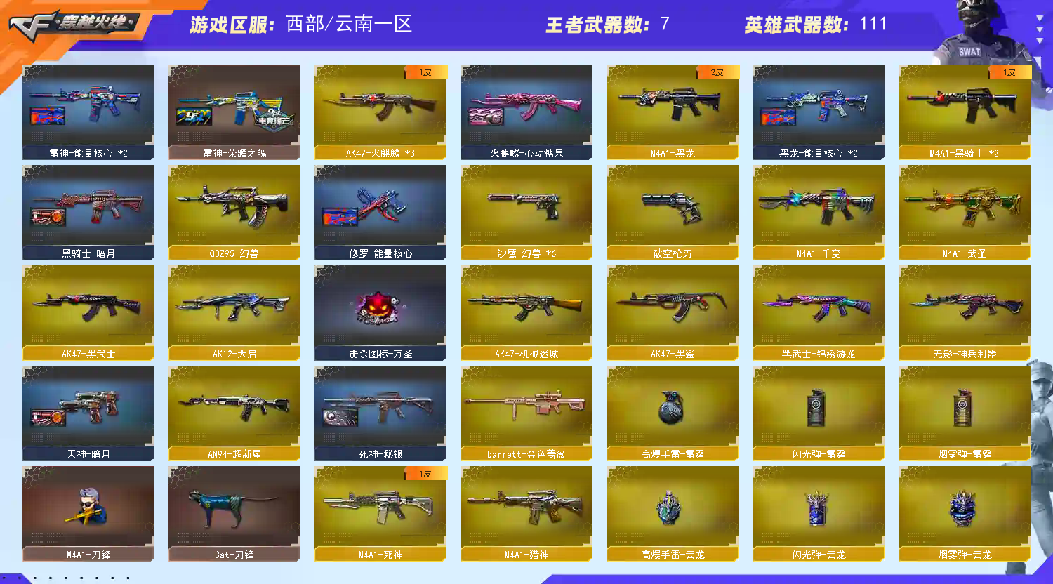 传说角色】:传说艾莉莎【热门武器】:Cat-刀锋,毒蜂,金色小号,加特林-炼狱,金刚伞,M4A1-黑骑士,QBZ03-金色蔷薇,RPK-盘龙,死亡之眼,斯泰尔-蝴蝶,沙鹰-修罗,汤姆逊-烈龙,金色蔷薇-古蛇迷踪,修罗-古蛇迷踪,炼狱-秦师,高爆手雷-幻兽【王者炫金武器】:王者之势,王者之武,炫金无影,炫金千变,炫金雷神,炫金毁灭,炫金天龙,炼狱-悦蓝【音效卡】:Barrett-毁灭,M4A1-雷神,AN94-超新星-热带奇洋,QBZ03-金色蔷薇-热带奇洋【皮肤】:火麒麟-心动糖果,毁灭-荣耀之怒,黑骑士-暗月,雷神-能量核心,雷神-荣耀之魄,天神-暗月,屠龙-荣耀之锋,雷神-暗月,黑龙-能量核心,黑龙-暗月,死神-秘银,极光-能量核心,修罗-能量核心【角色】:蝴蝶,葵,零,零-水下丽影,蜀雪,铁骑荣耀,王者之瞳,樱,蛇隐宗,奇洋探员,暗夜-X,初恋灵狐,飞虎队-X,风暴女,嘉年华灵狐,娟娟【人偶武器】:AWM-灵狐-15周年嘉年华,COP-旗袍,Cat-刀锋,灵狐娃娃手雷,M4A1-雷神-精英刀锋,M4A1-刀锋,迷你生化手雷,斯泰尔-蝴蝶,生化手雷-机甲核心,炼狱-秦师【暴走生化】:毒蜂,KAC-狂怒咆哮,死亡之眼【挑战大师】:冰龙粉碎者-白马银枪,阐释者III,激光毁灭者III-白马银枪【英雄级武器】:9A91-烈火,AK47-火麒麟,AK47-黑武士,AK12-天启,AN94-超新星,AK47-机械迷城,AK47-黑鲨,AWM-天龙,AWM-裁决,Barrett-毁灭,Barrett-极光,Glock18-武圣,加特林-炼狱,龙啸,M4A1-千变,M4A1-黑龙【源级武器】:源·火麒麟,御·火麒麟-平天大圣,御·黑龙-龙太子,源·雷神,魂·雷神-维纳斯,魂·雷神-新春神龙,魂-雷神-萌杀,魂·雷神-15周年嘉年华,御·雷神-机甲刑天,雷神-赛博朋克,御·雷神-葫芦兄弟,魂·黑骑士-现代金属,魂·黑骑士-幻能朋克,魂·黑骑士-娜塔莉娅,御·黑骑士·哪吒闹海,魂-死神-机甲核心【道具】:古蛇迷踪炫彩背包,奇洋探员-海龟背包,战舰背包,炫彩背包,热带奇洋炫彩背包,超级背包,绿色巨人,灵魂忍者,变异宝贝,妖姬,迷雾幽灵,生化弹匣,夺命之镰,防化服,金色流光-枪王排位,星辰流光-枪王排位【特殊枪械】:1蝴蝶斯泰尔,1炼狱,1黑骑士,1盘龙,1烈龙;传说艾莉莎,RPK-盘龙,QBZ03-金色蔷薇,