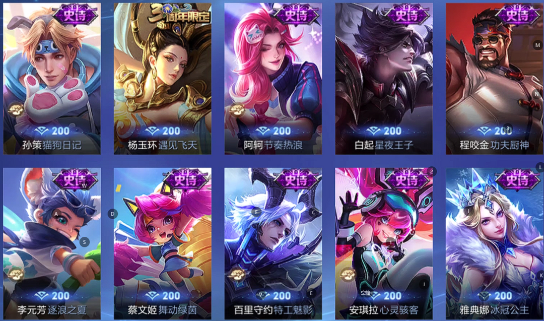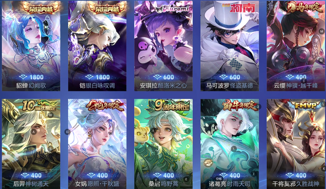 V10、550皮14水、吕布典藏-千魇归渊、云缨-神骥·越千峰、怪盗基德、伽罗星传说红枫、瑶典藏拾光映像、冥王哈迪斯、、龙年限定、齐天大圣