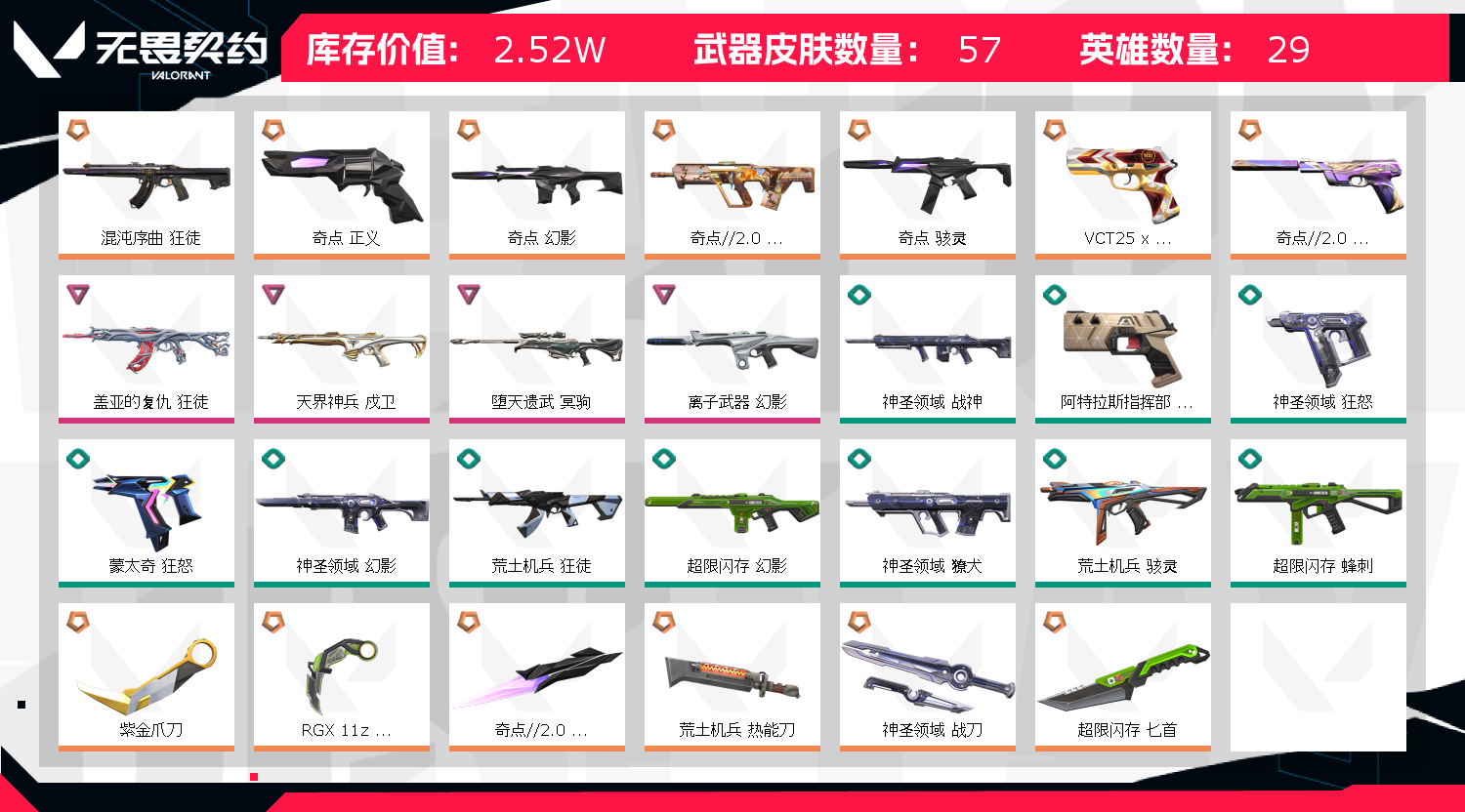 首页 > 租号大厅 > 无畏契约-wegame > wegame/wegame > H可排位 回火奇点套装 奇点2.0套装 盖亚ak 混沌ak 堕天大狙 vct标配 紫金显卡爪刀