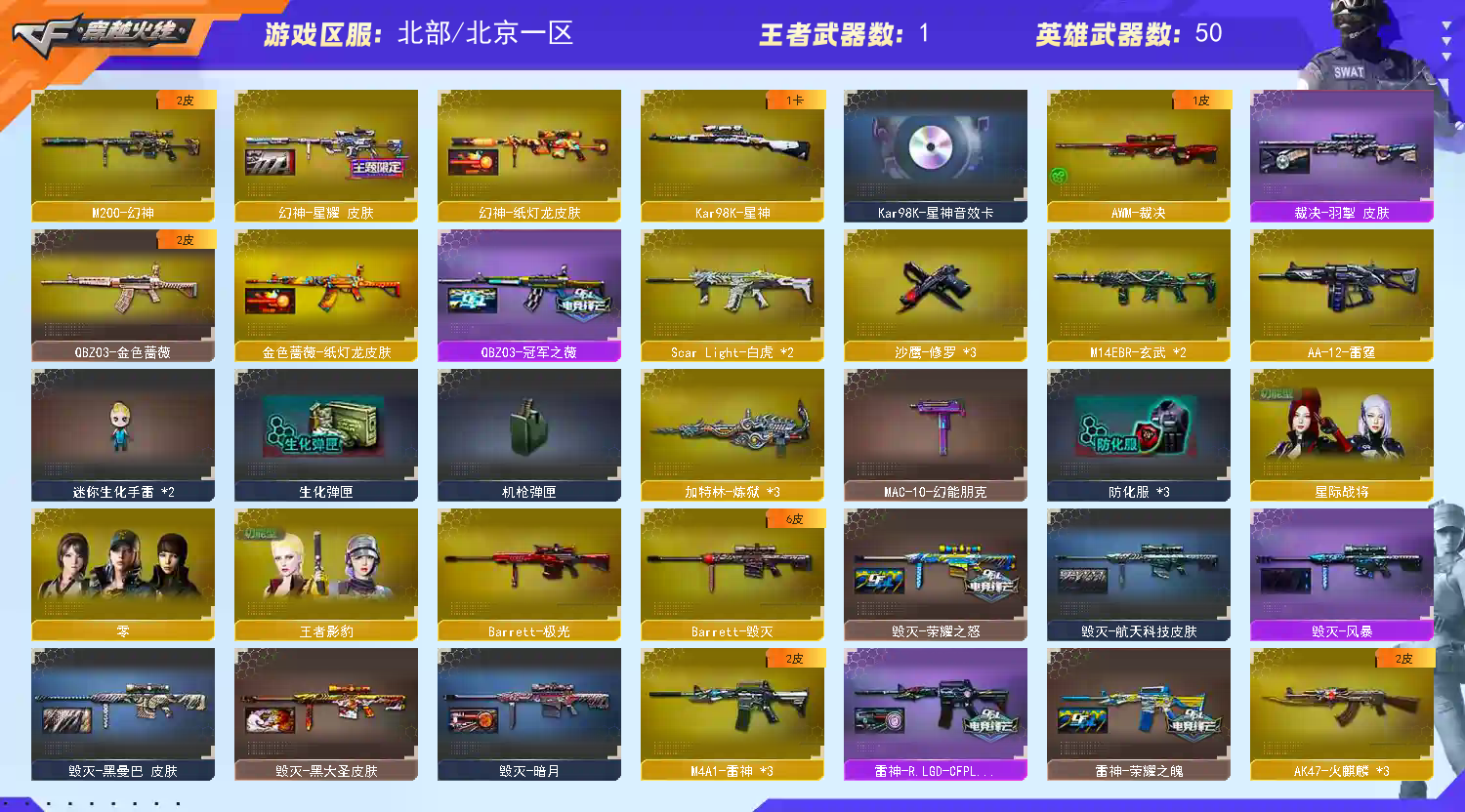 【m200幻神+星耀皮肤+纸灯笼皮肤】【98k星神+星神音效卡】【qbz03金色蔷薇+冠军之薇皮肤+纸灯笼皮肤】【雷神+荣耀之魄皮肤+lgd冠军皮肤】【王者之怒】【常胜将军 战神 无影神兵利器 超新星 白虎电玩 暗月传说 】——【热门武器/小人呛】【天龙曼陀罗 芭蕾特曼陀罗 】——【幻灵之锋 龙啸 麒麟刺 屠龙 擎天云海游龙】——【幻灵投掷武器套装】——【角色】【4防王者影豹】【星际战将】;QBZ03-金色蔷薇,M200-幻神,Scar Light-白虎,Kar98K-星神,